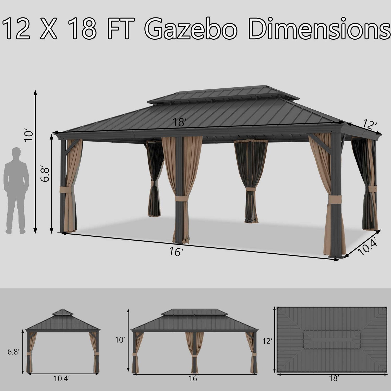 Yardsight 12' x 18' Hardtop Gazebo, Aluminum Frame Pavilion with Galvanized Steel Double Roof Heavy Duty Permanent Gazebo with Mosquito Netting and Privacy Curtain for Patio, Garden, Lawn.