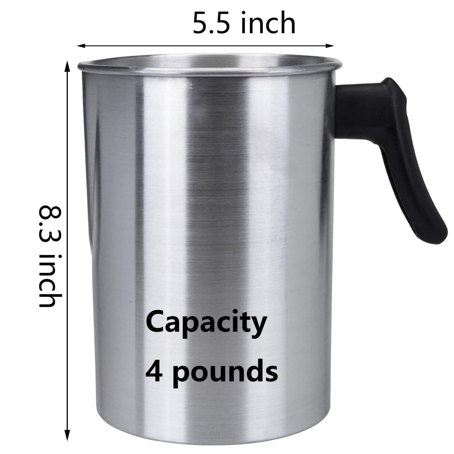- It has an ideal capacity of up to 4 pounds of melted wax. Height 8.3 inch by 5.5 inch in diameter. The pouring pot is perfect item for DIY candle making.