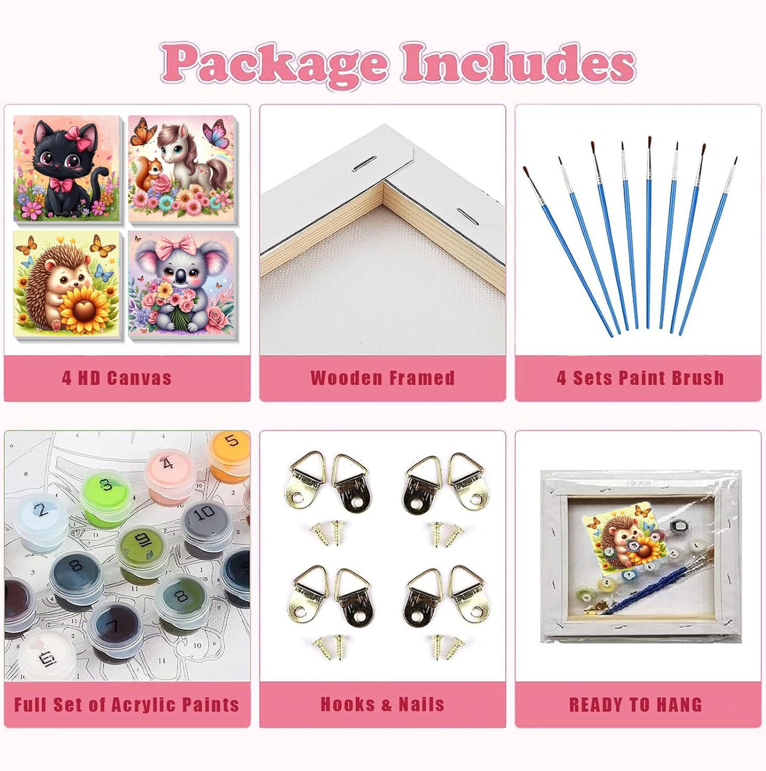 - 【Your child will get】Paint by numbers Set includes pre-printed canvas (with frame)*4, acrylic paint set*4, quality paint brush set*4, metal hooks*8.