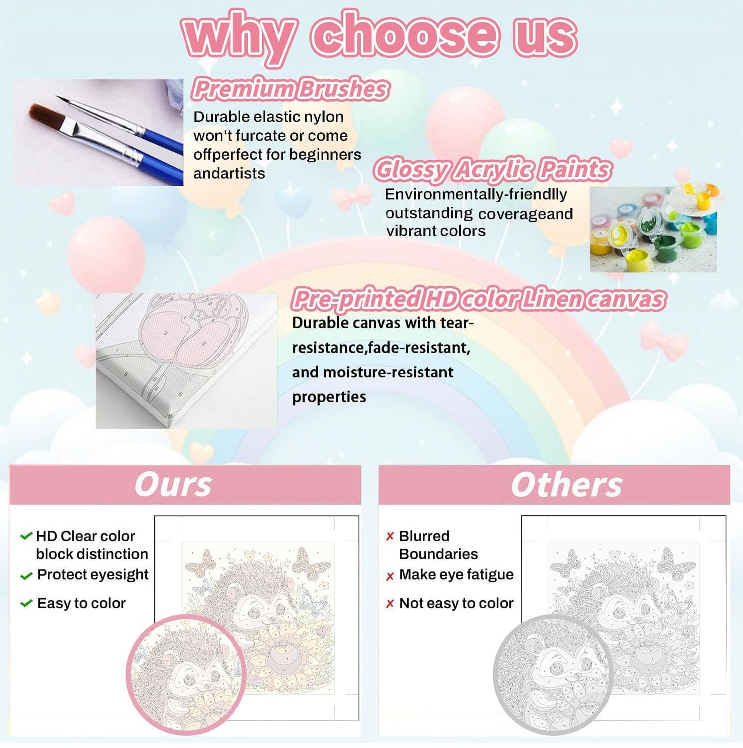 - 【Professional canvas and quality brushes】Paint by numbers use colourful high-definition canvases, which make it easier to distinguish the numbered areas, and it's not easy to fatigue your eyes for long hours of painting, so you can protect your child's eyesight well. Different sizes of high quality brushes are not easy to fall off or crack. It can provide you with more detailed help to create more vivid and realistic works.