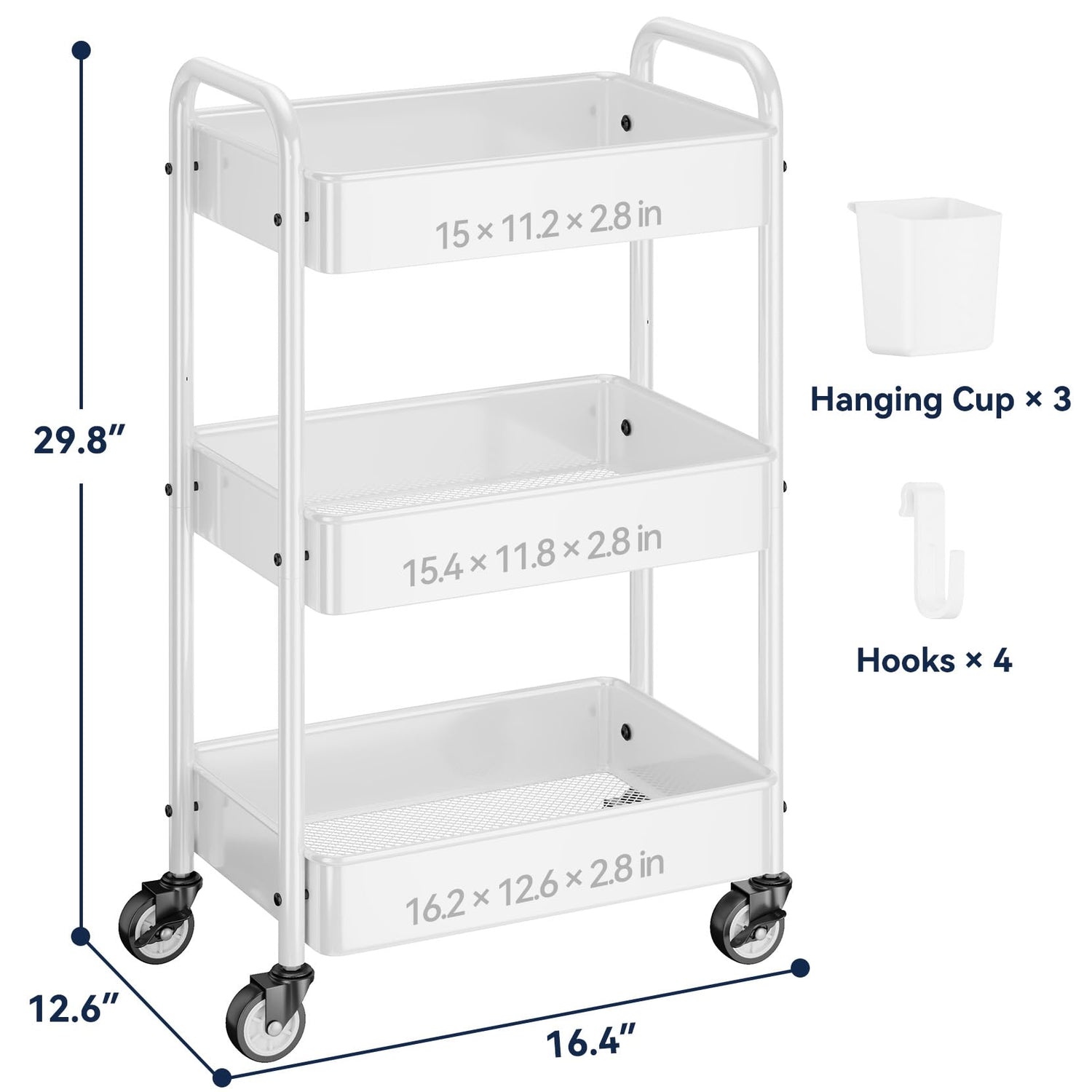YASONIC Metal 3 Tier Rolling Cart - Heavy Duty Utility Cart with Lockable Wheels, Hanging Cups, Hooks, Mesh Rolling Storage Cart Craft Cart Organizer, Lightweight and Sturdy, White
