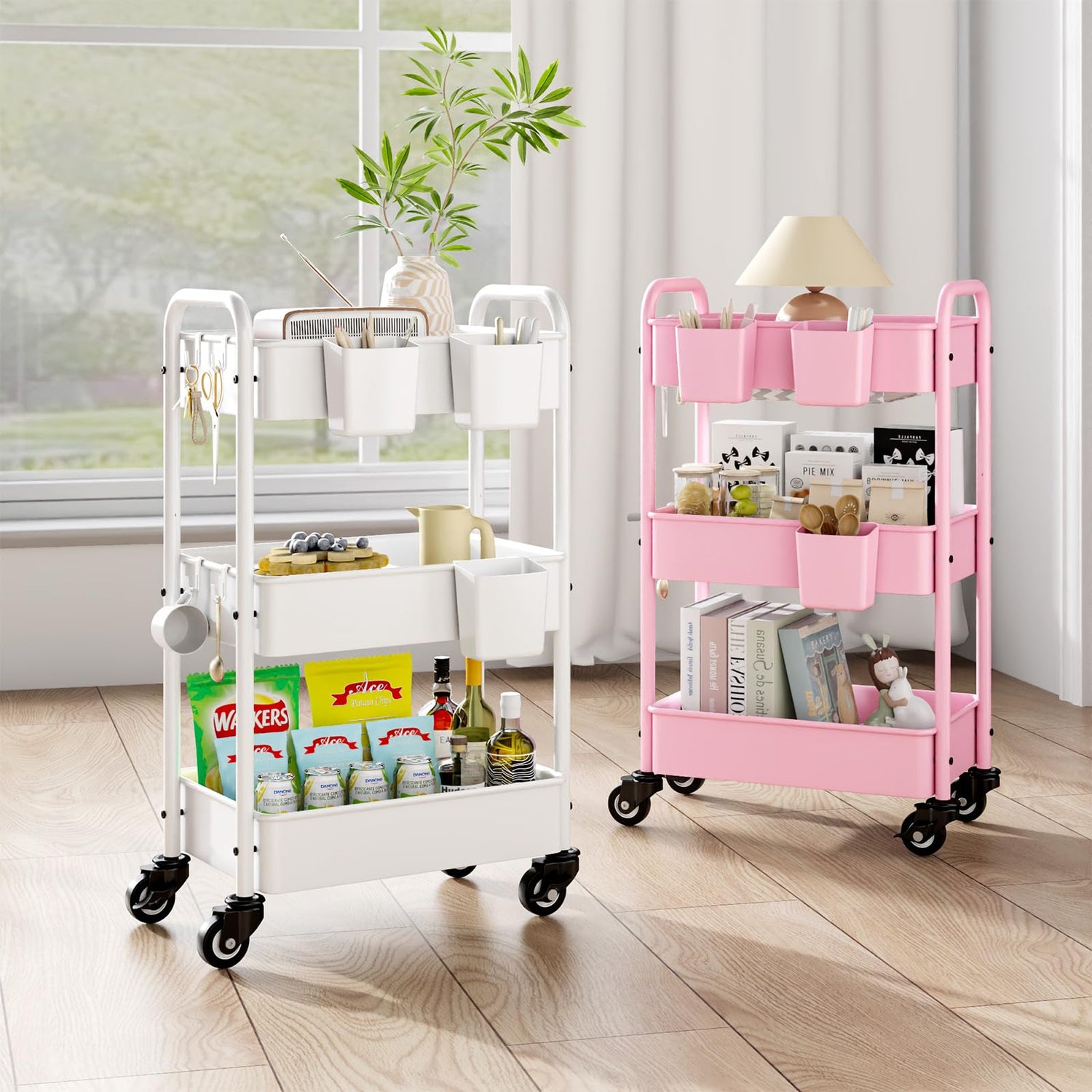 - Expanded Storage Capacity, Multiple Uses: The metal cart features 3 baskets, suitable for use as a craft cart, cleaning carts, book cart, art cart, makeup cart, diaper cart, service cart, snack cart, etc. and the added 3 hanging cups and 4 hooks provide extra space for small items