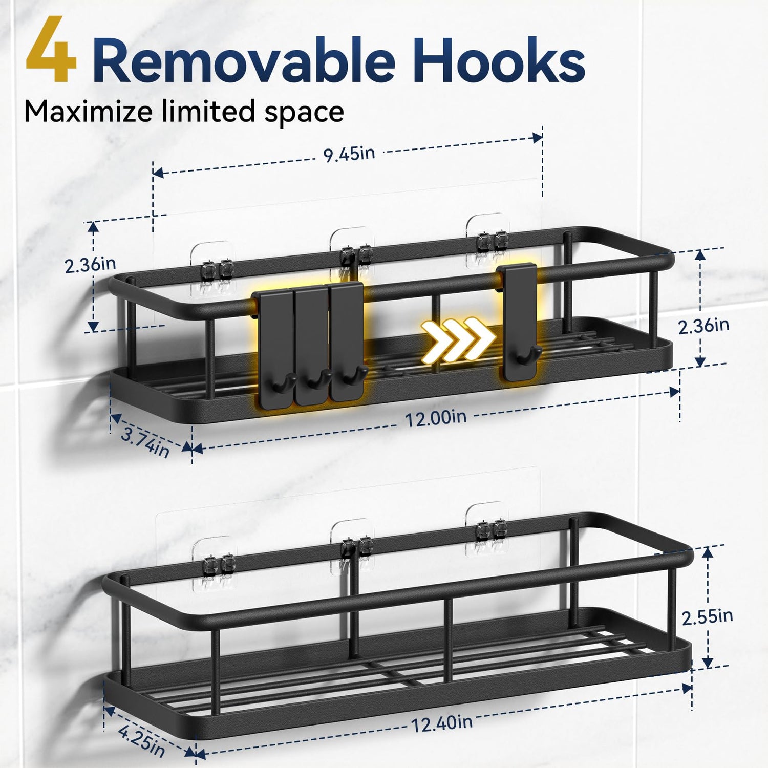 - 【2 Shower Organizer Racks for Inside Shower】With 2 shower caddies (Different sizes), 4 removable hooks, and 2 adhesives, the large capacity of this bathroom organizer easily holds toiletries or cooking seasonings, making your life easier. Maximize the use of minimal space to organize your bathroom, kitchen, RV, bedroom, living room, laundry room, etc
