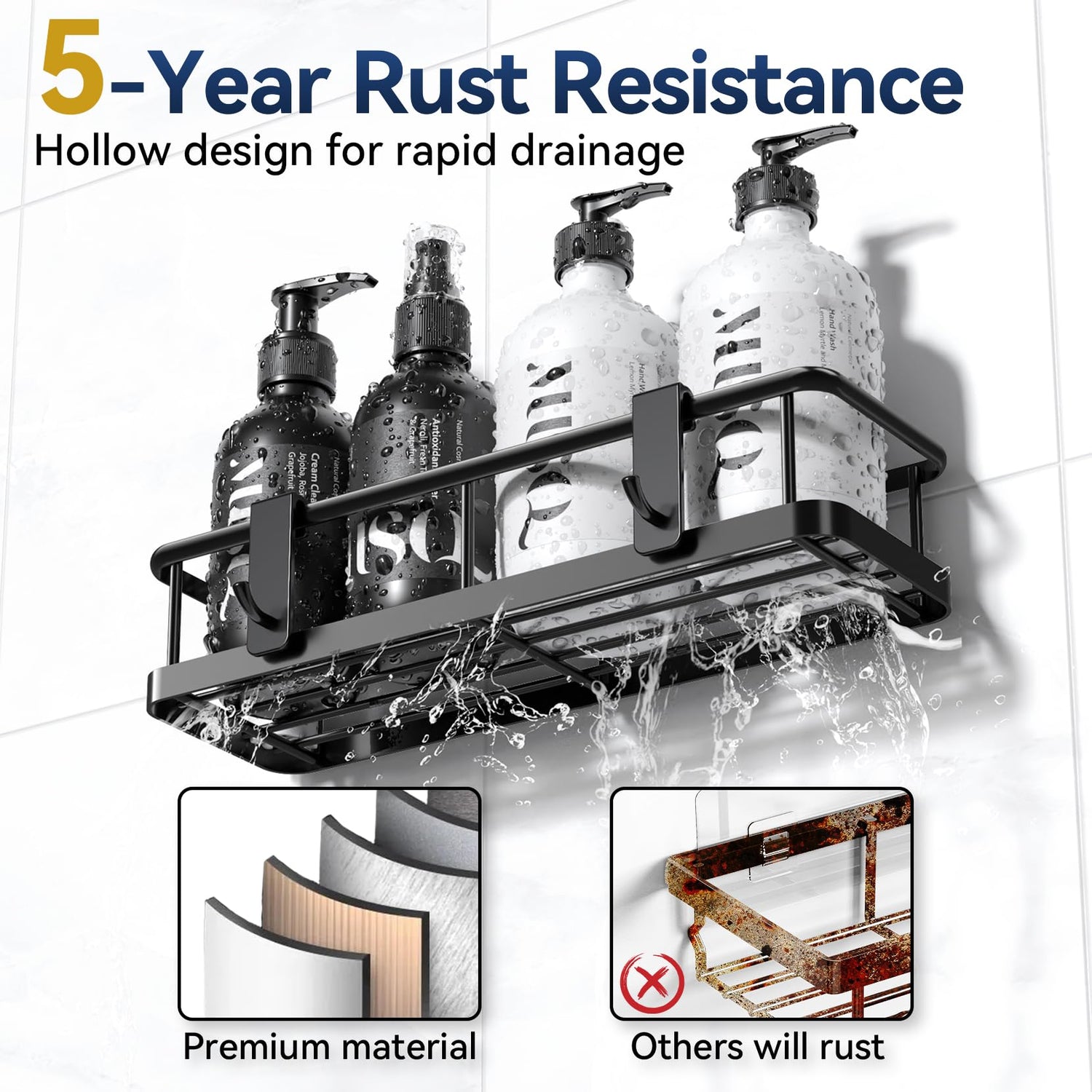 - 【Durable Metal, Hollow Drain Design】The bathroom shower racks are made of high quality metal, high temperature paint process, durable; Passed the 48-hour salt spray test, rust resistant, waterproof, scratch resistant, can accompany you for up to 5 years. Hollow design at the bottom, good ventilation and drainage, convenient cleaning. Keep shelves and bathroom necessities dry