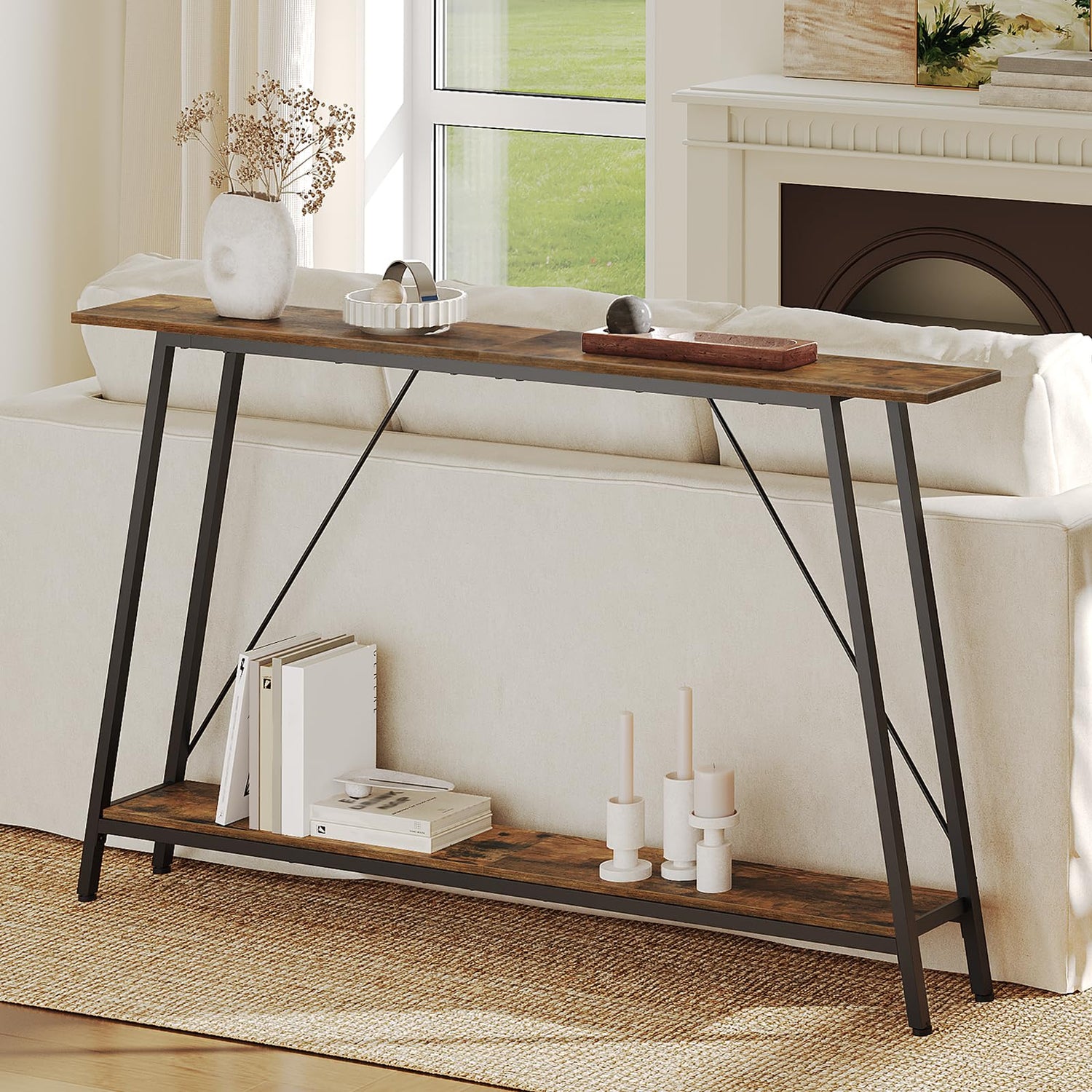 - Large Storage Shelves: Compared to a regular single-layer storage shelf, this skinny long entryway table features double shelves that are made of particleboard, supporting you to store and display more items in an organized manner