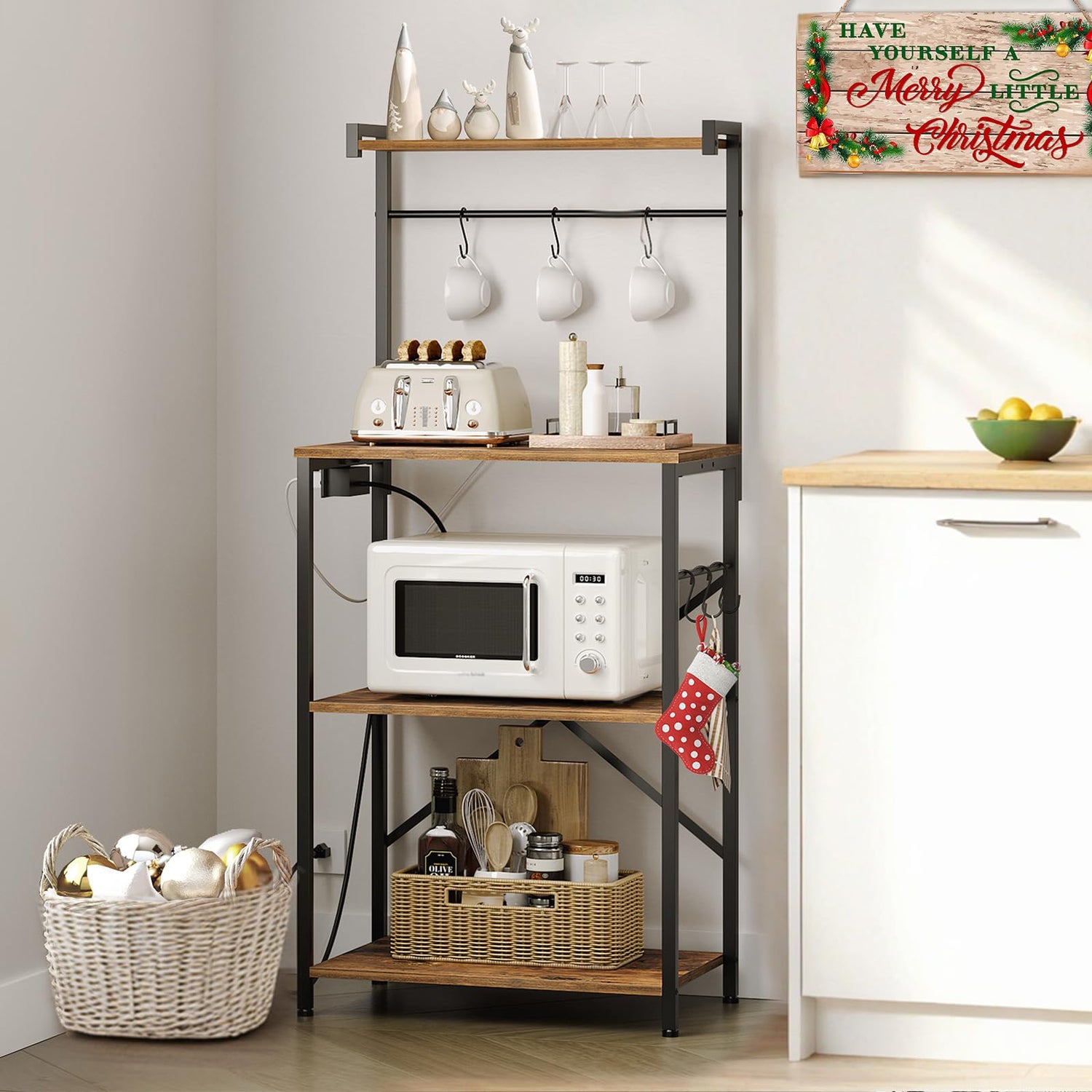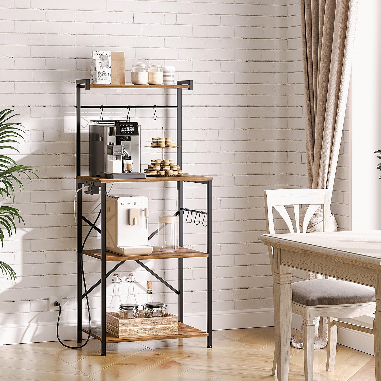 YATINEY Bakers Rack with Power Outlets, 4 Tier Microwave Stand, Coffee Bar Station with 6 S-Shaped Hooks, X-Shaped Back Support, for Kitchen, Dining Room, Living Room, Rustic Brown and Black HB21BR