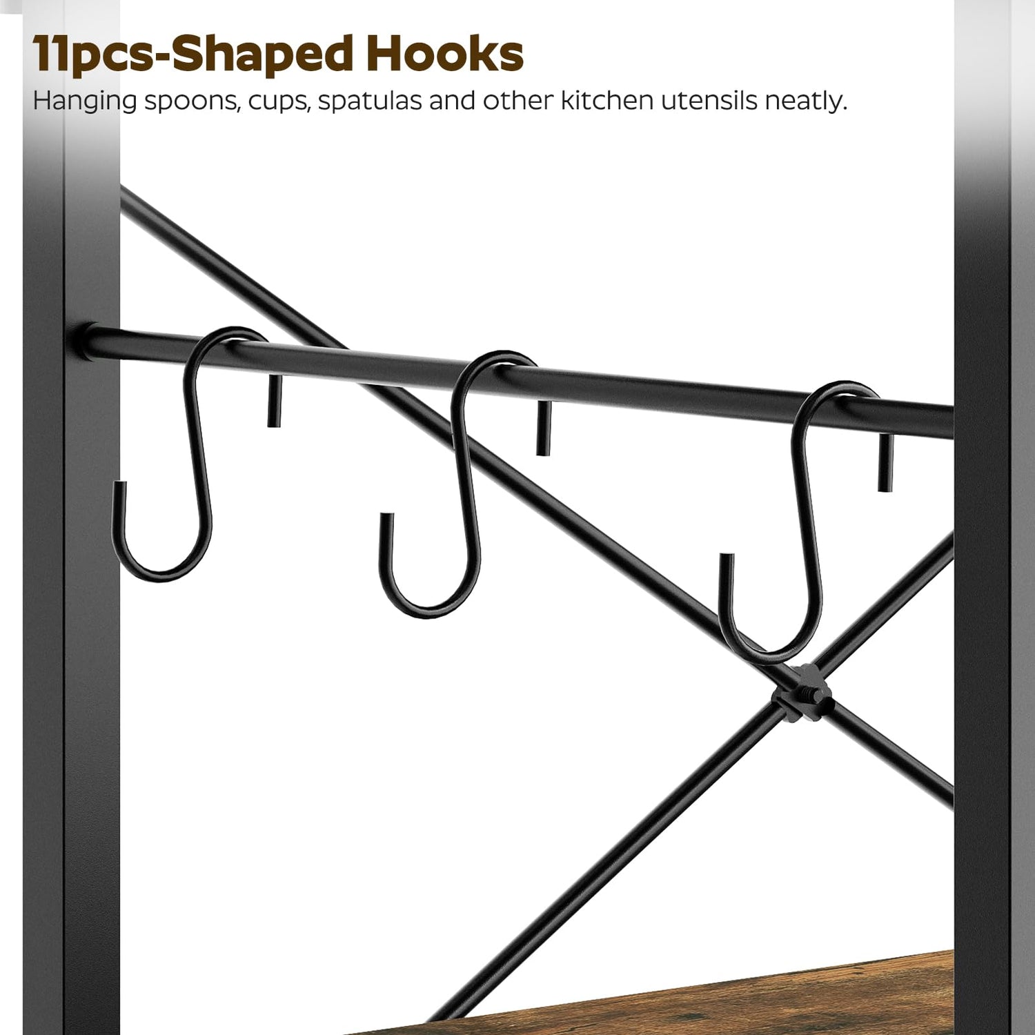 - Efficient Storage: The bakers rack has 4 shelves with an upper narrow shelf for small spice bottles and 3 lower shelves for microwaves, coffee makers and other kitchen appliances. 11 S-shaped hooks hang various kitchen utensils like spoons