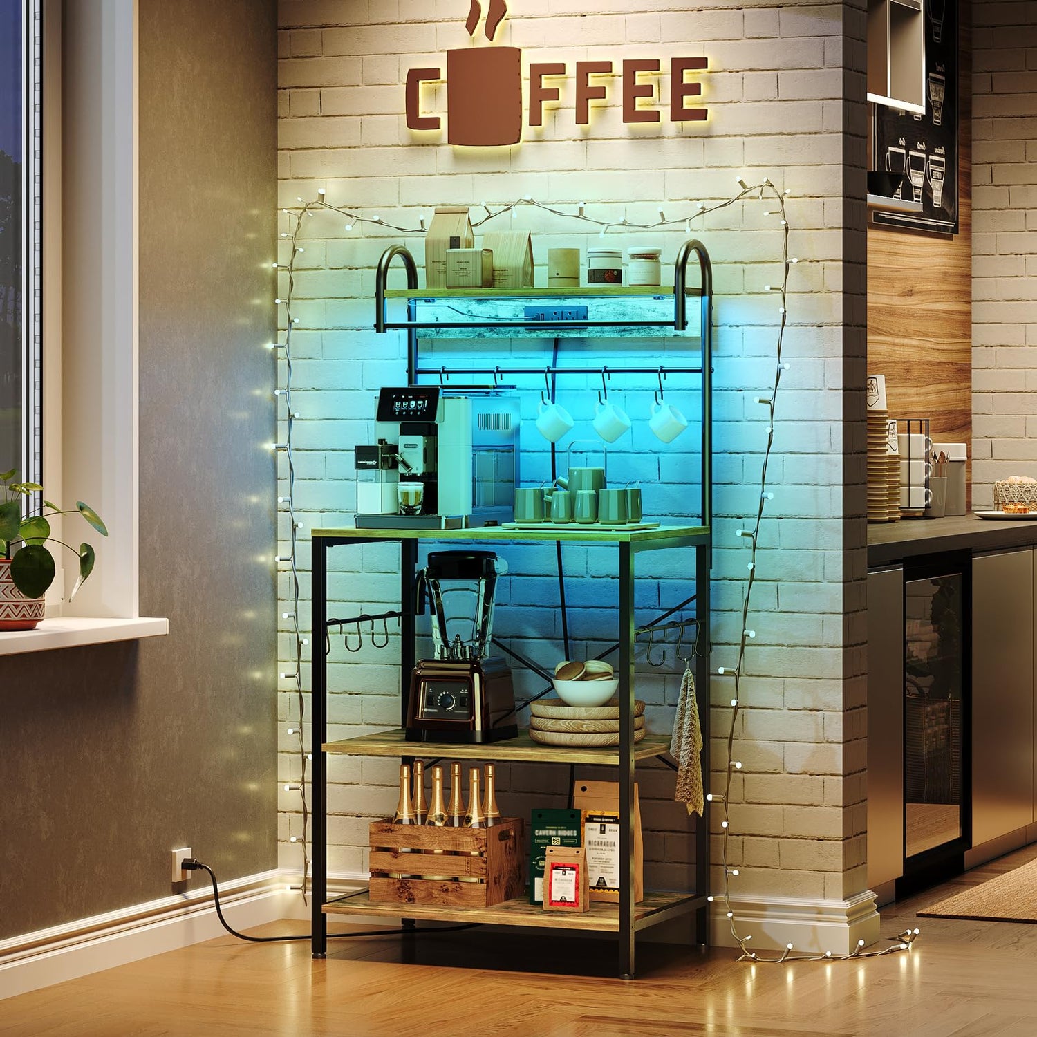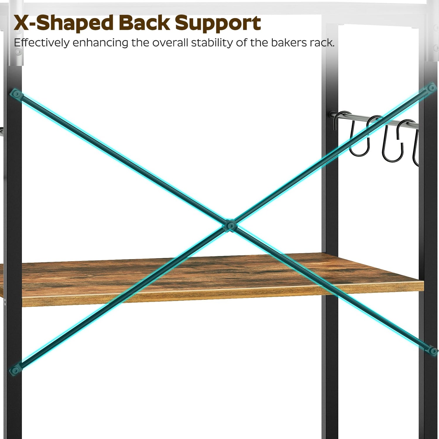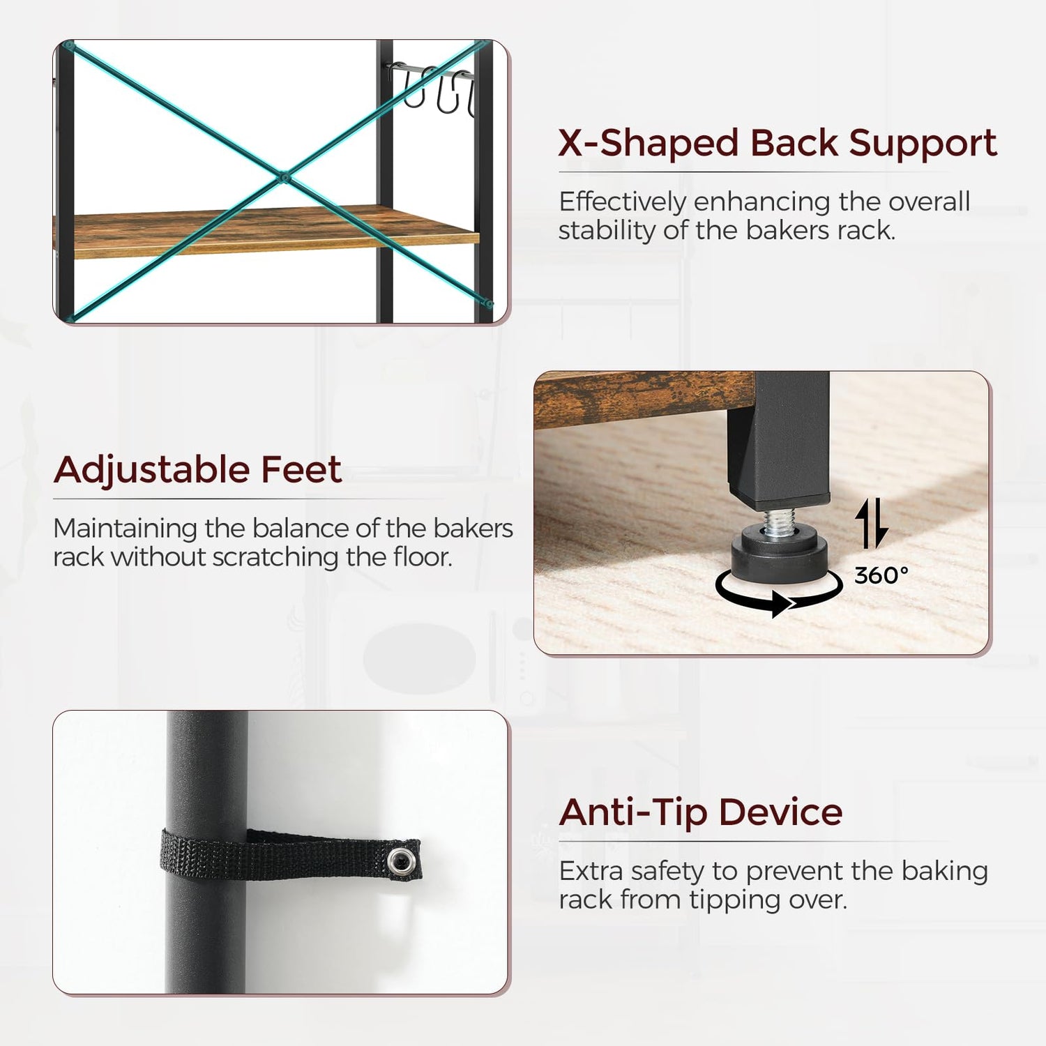 - Quality Baking Rack: Crafted from premium panels and a sturdy metal frame, this coffee bar is durable. An X back support enhances structural stability. With adjustable feet and an anti-tip device, this coffee bar stands stable without tipping over