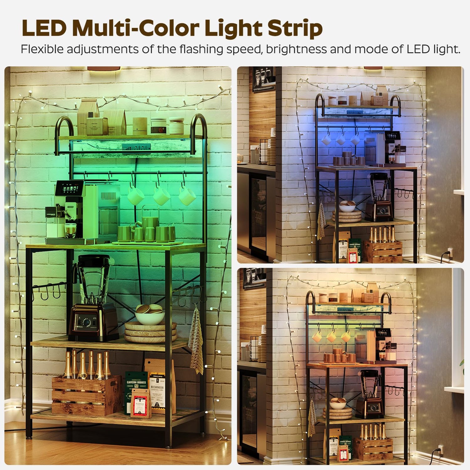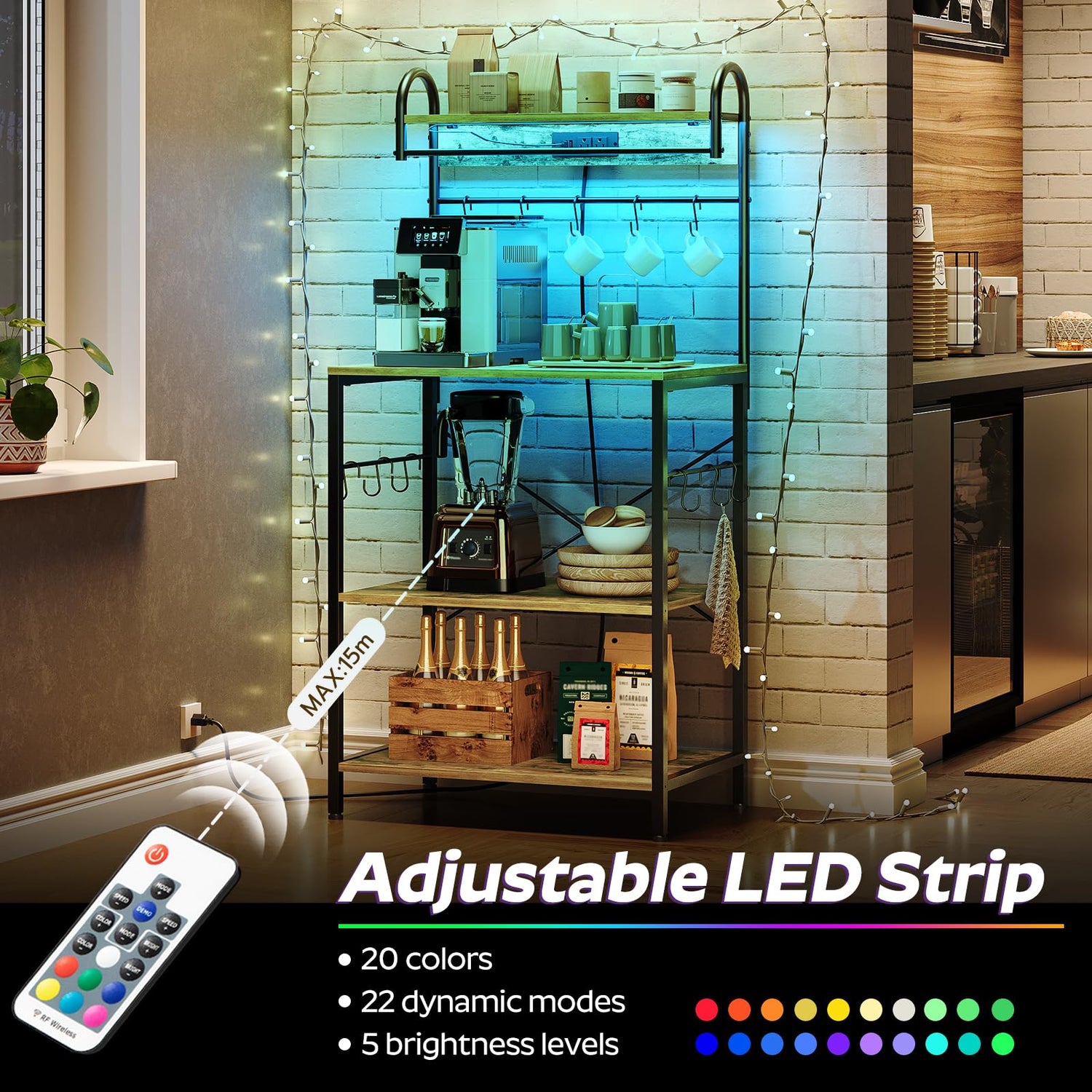 - LED Light Strip: The microwave stand has an LED light strip featuring 20 colors, 22 modes and 5 brightness levels to add radiance and color to your baking space with a remote control. Snap-on fasteners prevent the light strip from falling off