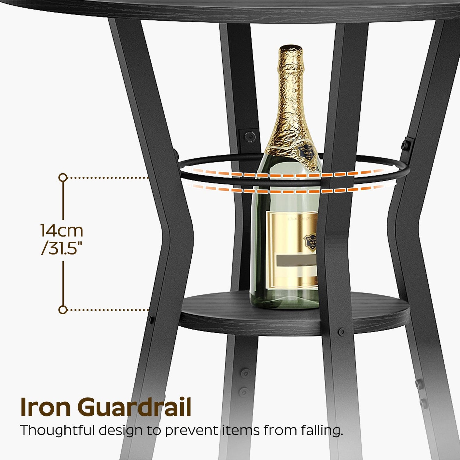 - 2-Tier Storage Table: Measuring 20.5”L x 20.5”W x36.6”H, the bar table boasts a spacious top and a handy lower shelf with ample open storage space for easy item access. The iron guard prevents items from sliding off and ensures safety