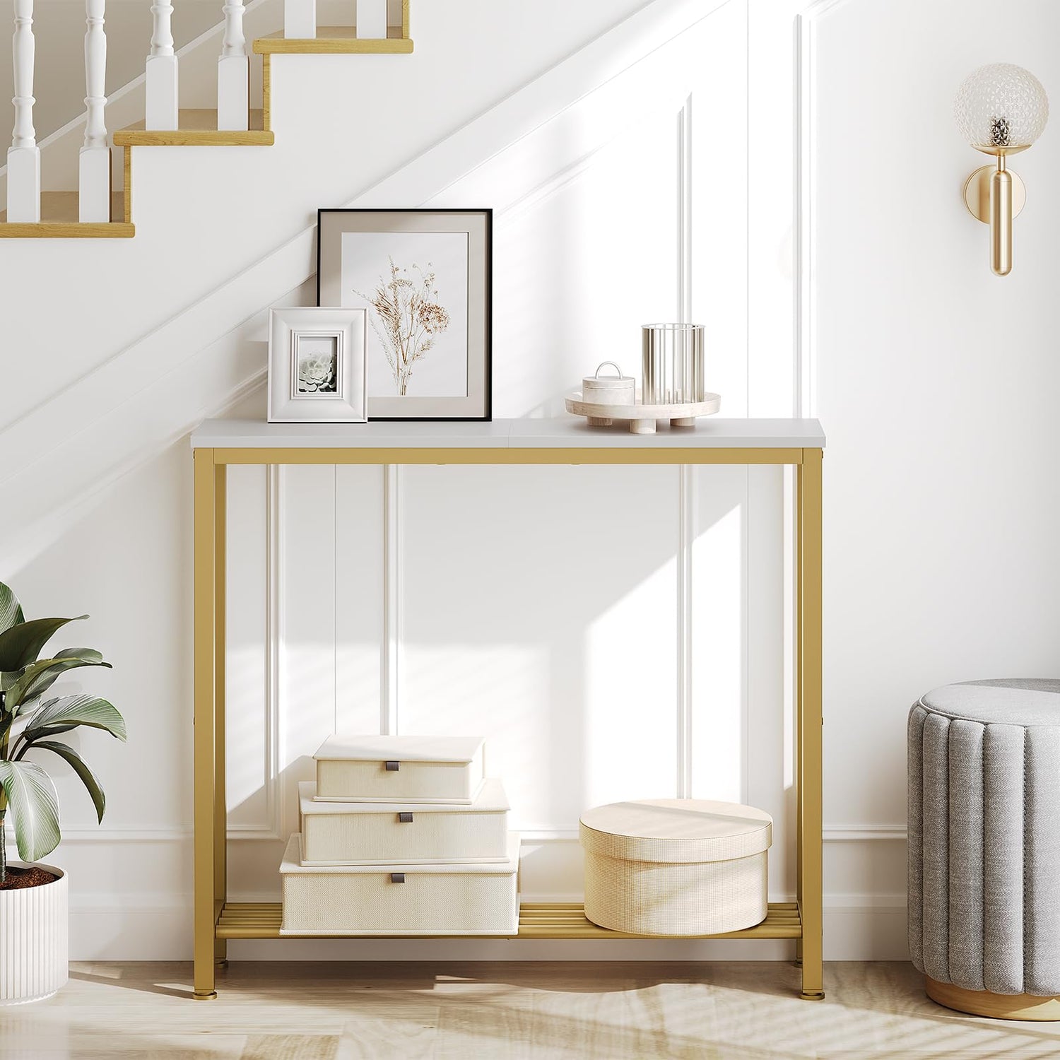 YATINEY Narrow Console Table, 2-Tier Small Sofa Table, 29.5" Thin Entryway Table, Behind Couch Table with Shelves, Industrial Hallway Table, for Living Room, Foyer, White and Gold CT03DW