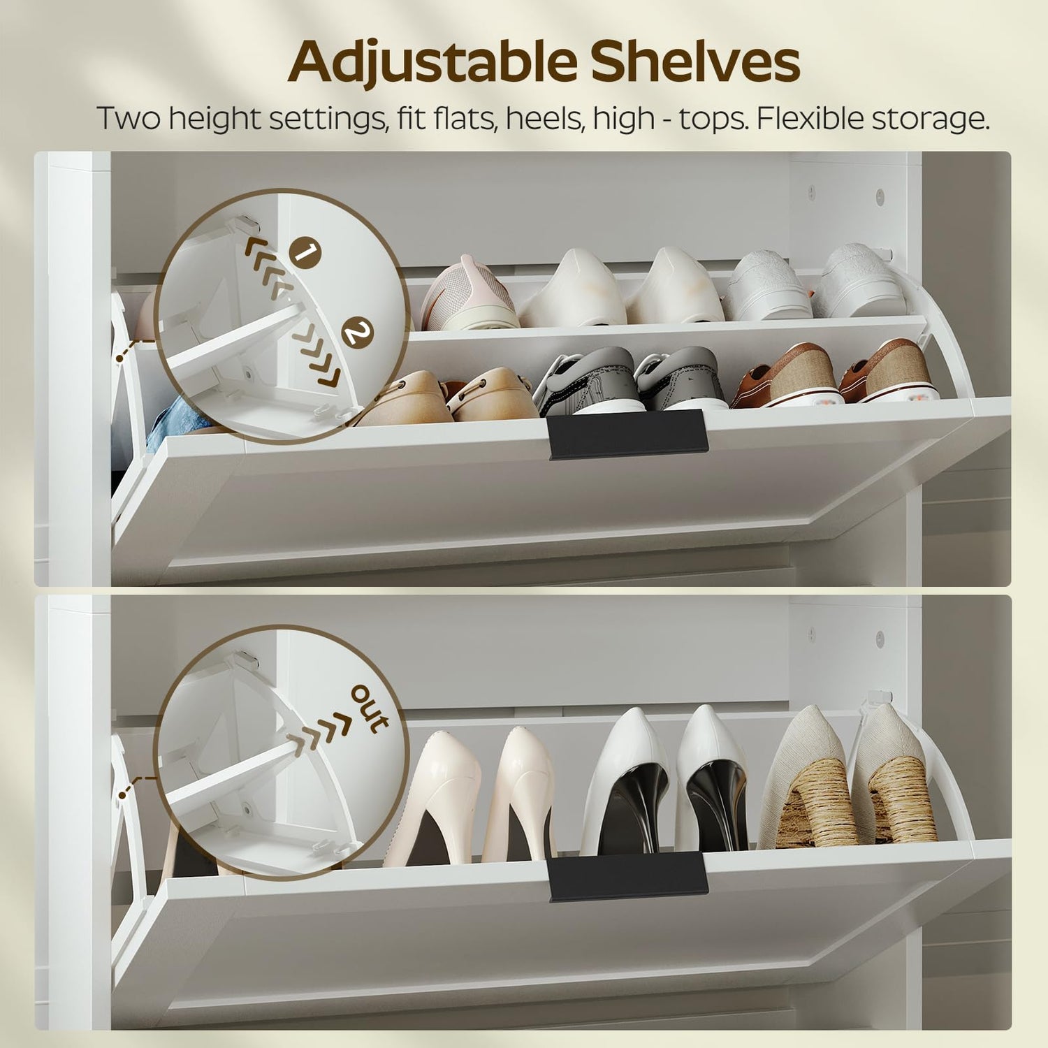• Rich Storage: The shoe cabinet has 3 open shelves for small ornaments, dolls, etc., and 2 hanging racks with 5 movable hooks for keys, umbrellas, and more. 2 flip-down drawers with adjustable shelves store shoes well, allowing you to have various storage needs to store boots, sneakers, heels, and flats.