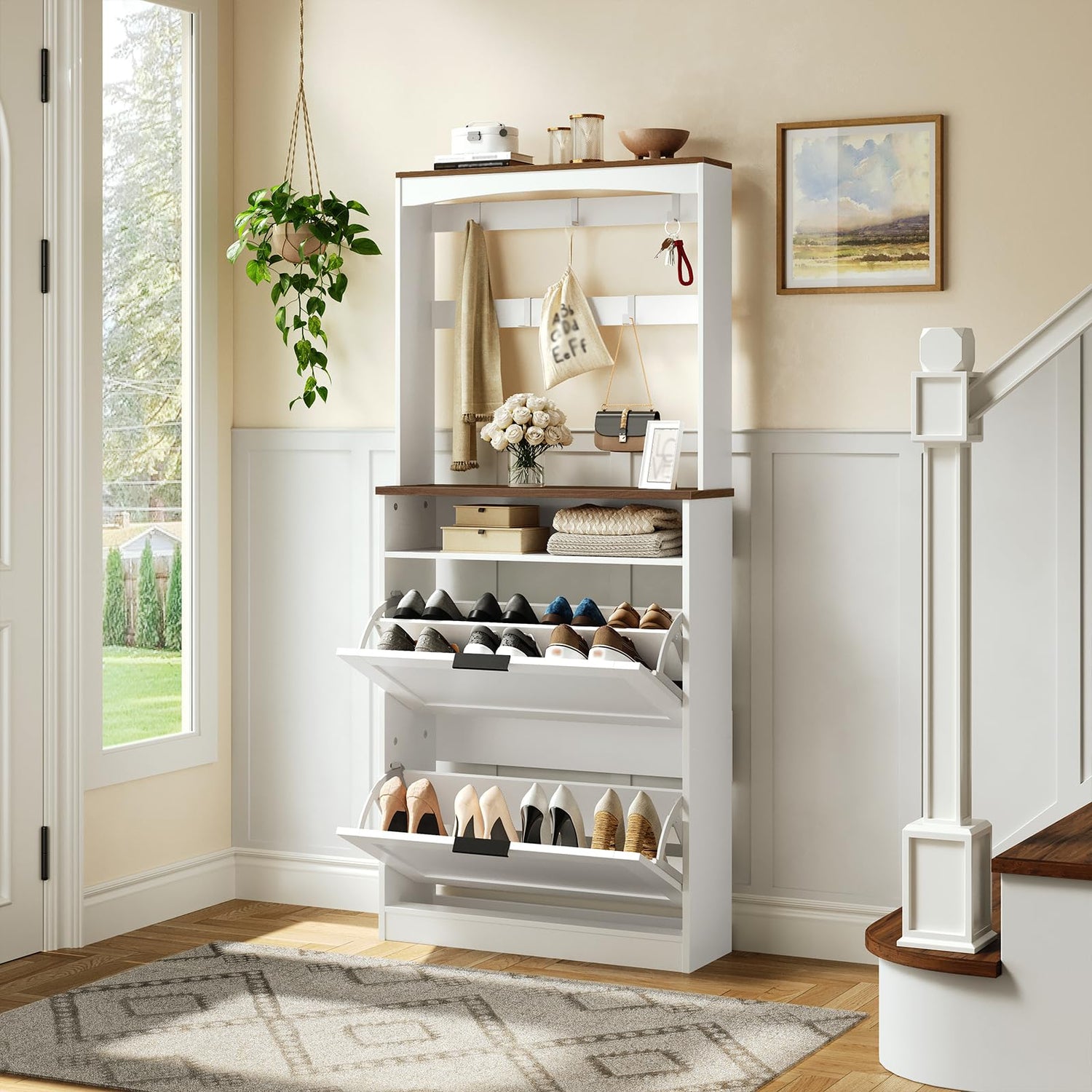YATINEY Tall Shoe Cabinet with Flip Drawers and Coat Rack, Floor Standing Modern Shoe Storage Organizer, 2-in-1 Hall Tree with Movable Hooks and Open Shelves, for Entryway, White and Walnut SC01WH