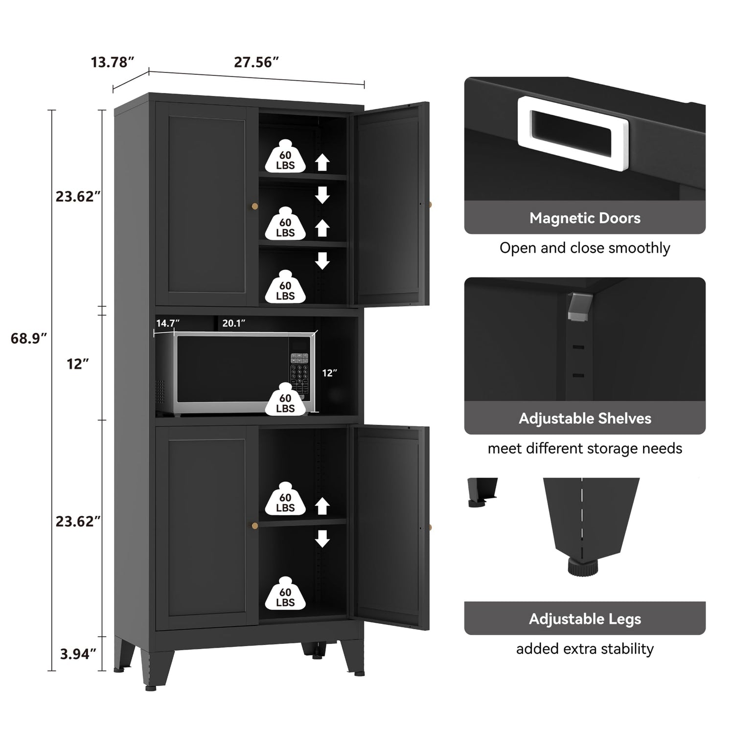 YAUWOH 69''Metal Pantry Storage Cabinet with 4 Doors & 3 Adjustable Shelves,Kitchen Pantry Cabinet with Microwave Shelf,Microwave Stand with Storage for Kicthen,Dining Room,Bathroom Black