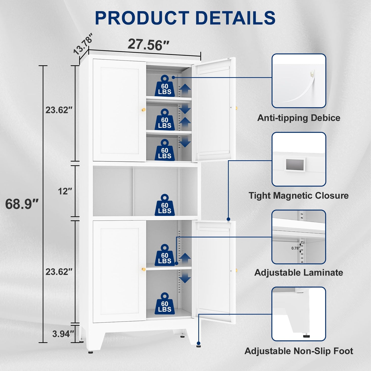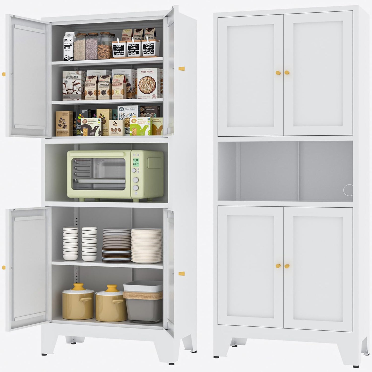 YAUWOH Metal Kitchen Pantry Storage Cabinet, Metal Freestanding Bathroom Floor Cabinetwith 4 Doors & 3 Adjustable Shelves, Metal Storage Cabinet for Bathroom, Living Room, Kitchen, Pantry, White