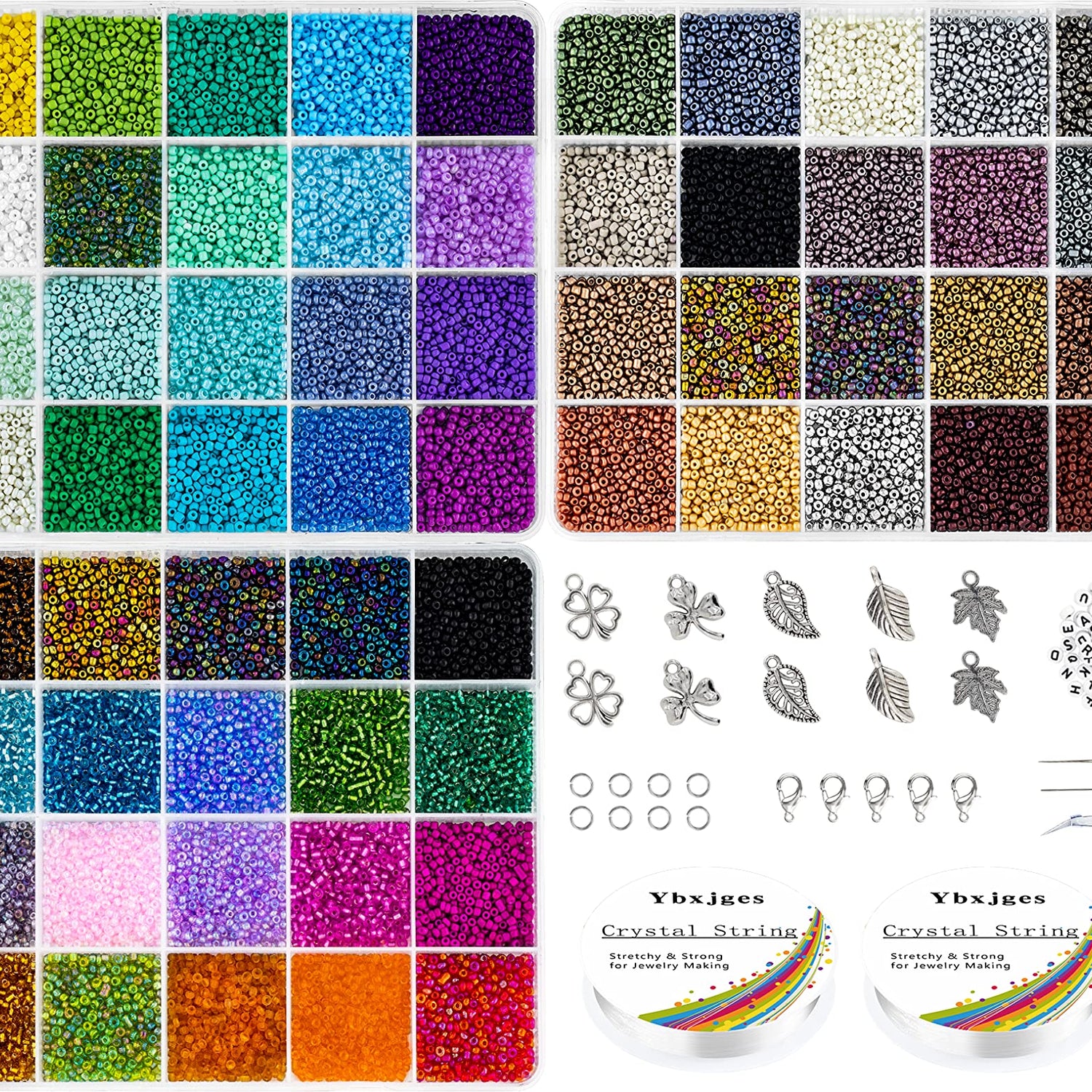 Ybxjges 42000Pcs 2mm Glass Seed Beads 12/0 Small Tiny Beads Kit with 150Pcs Alphabet Letter Beads Pendants Charms Jump Ring Elastic String for DIY Bracelets Necklace Jewelry Making Supplies