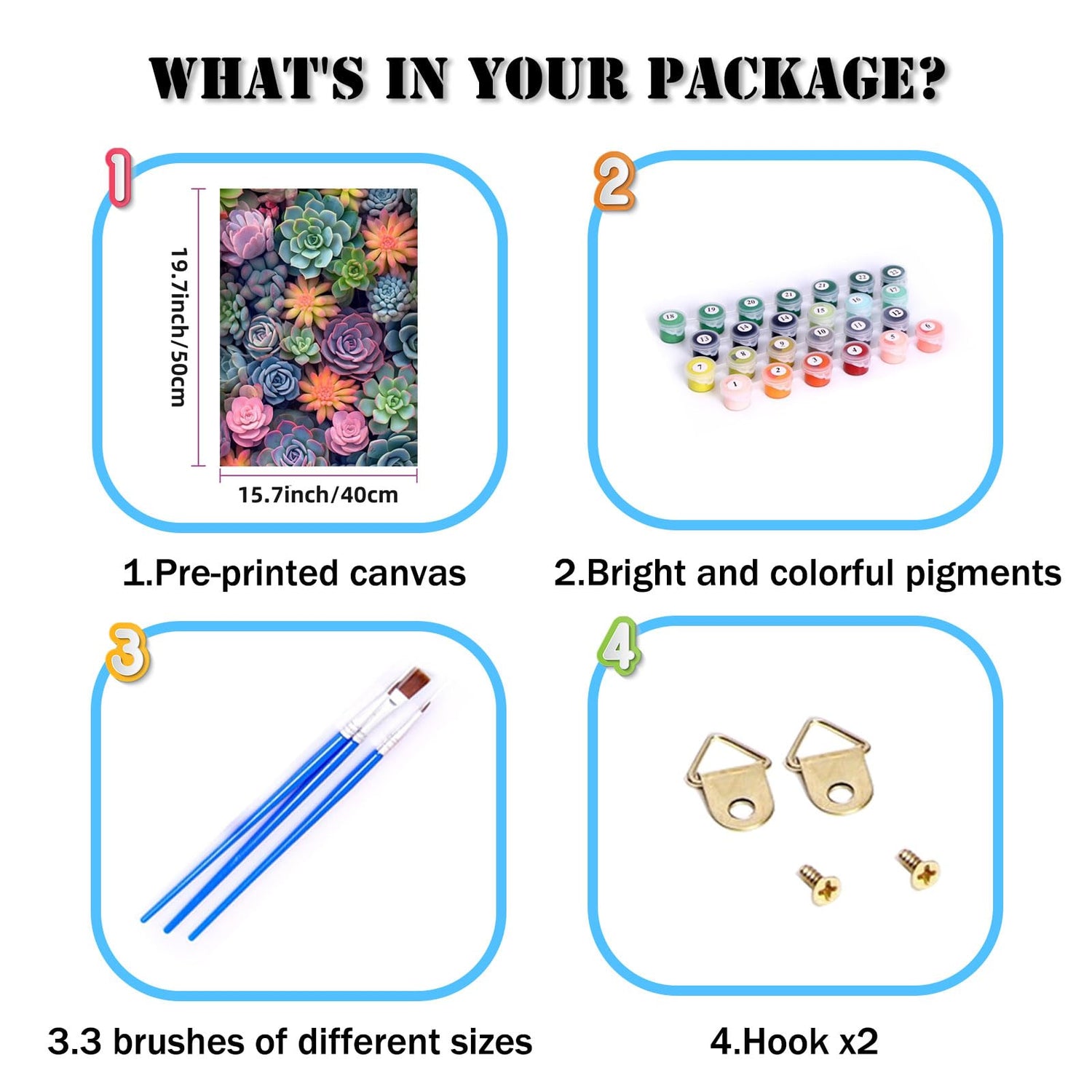 - 1.Succulent paint by number kits include:pre-printed canvas x 1,acrylic paints x 1 set,brushes of different sizes x 3,hook x 1 set.