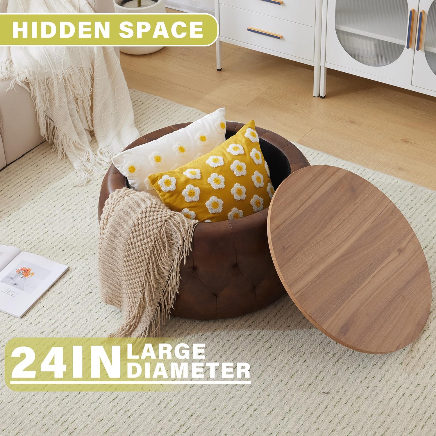 YDcosyfy PU Leather Round Storage Ottoman with Wooden Lid, 25 Inch Tufted Circle Ottoman Footrest Stool Bench Coffee Table for Living Room,Brown