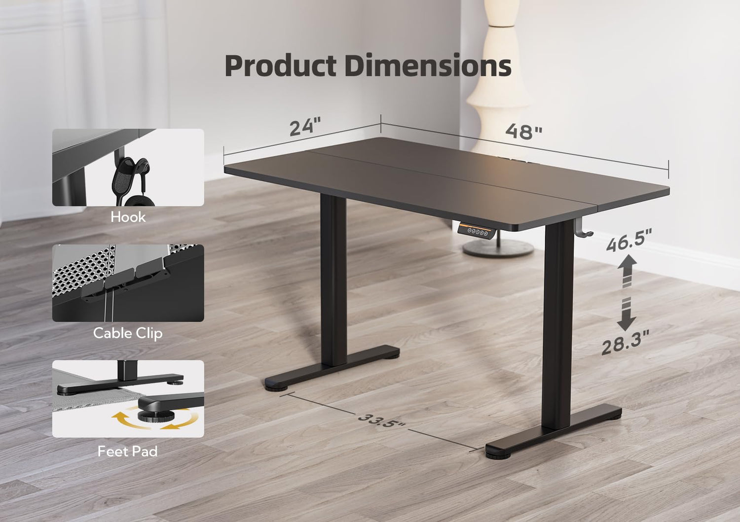 - Height Adjustable & Quiet: The adjustable desk is equipped with a reliable motor that smoothly adjusts the height from 28.3" to 46.5". The motor operates quietly with noise levels under 50 dB, ensuring a peaceful and stable adjustment process, making it ideal for quiet workspaces.