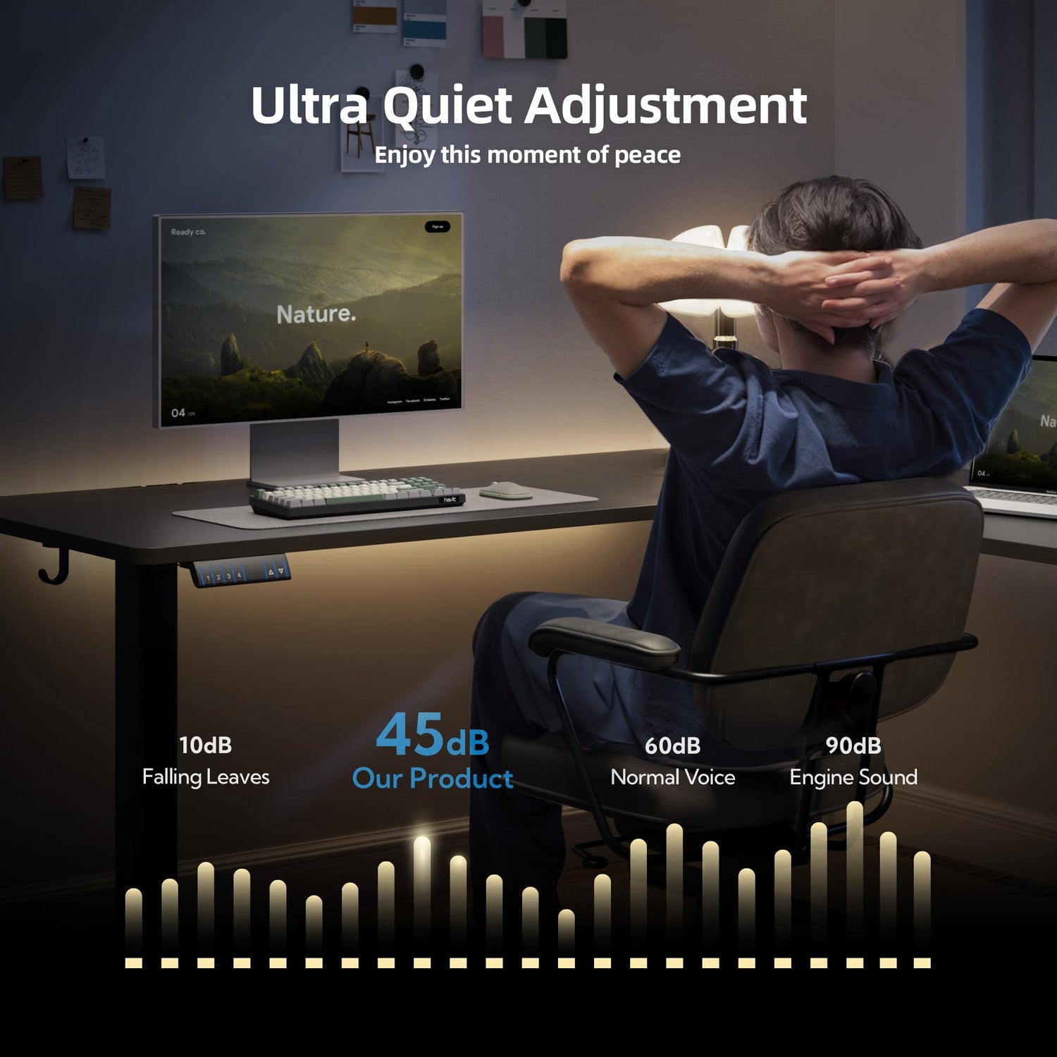 - Quiet Lift Mechanism: The lifting process is designed to be silent, ensuring you can adjust your desk without disturbing coworkers or family members. Even during peak hours, you can quietly change the height, without affecting your environment. The durable construction guarantees smooth, stable movement for years, with no wobbling or instability, even with frequent adjustments.