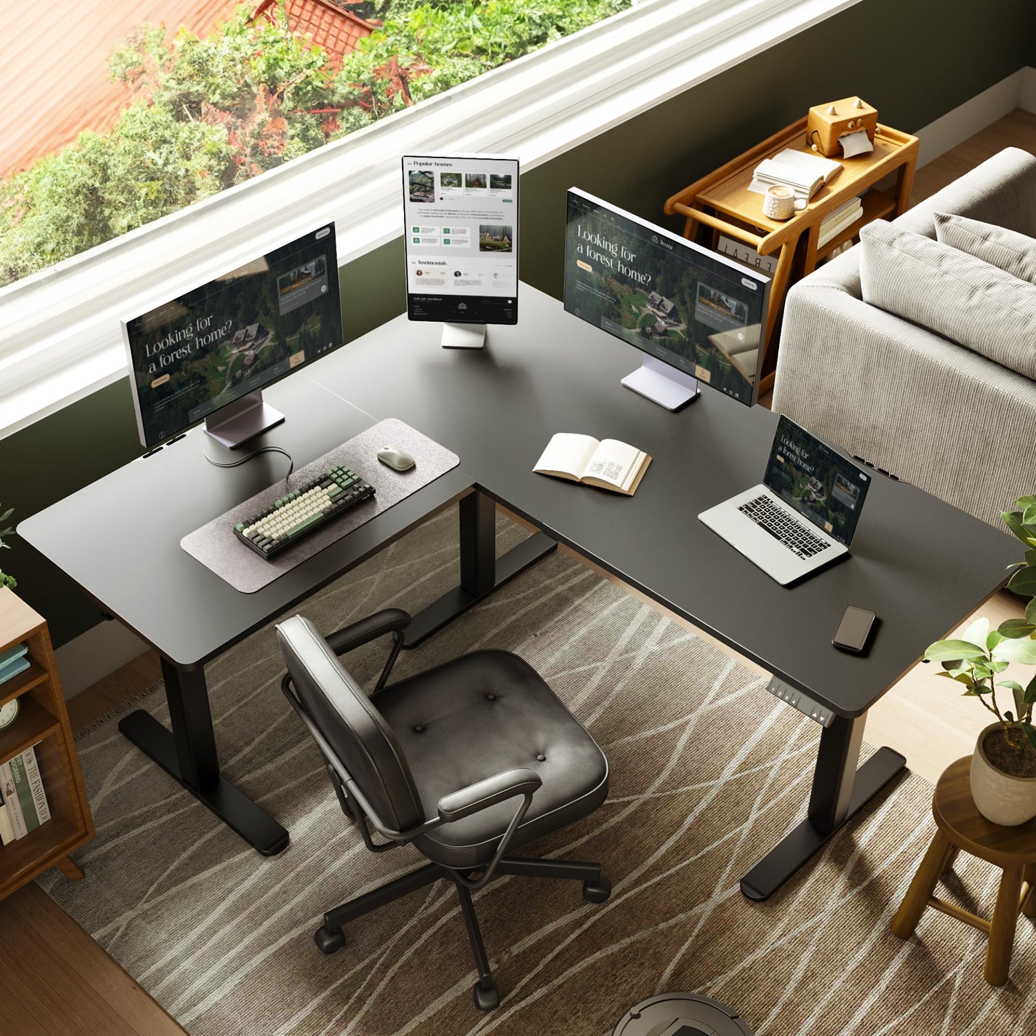 - Spacious Desktop Area: The wide desktop provides ample space to accommodate multiple devices. Whether you're using dual monitors, a computer, a filing rack, or everyday office supplies, this standing desk l shape can easily hold it all without cluttering your workspace. For those who work with multiple devices at once, this design helps boost productivity by minimizing device switching and keeping everything you need within reach.