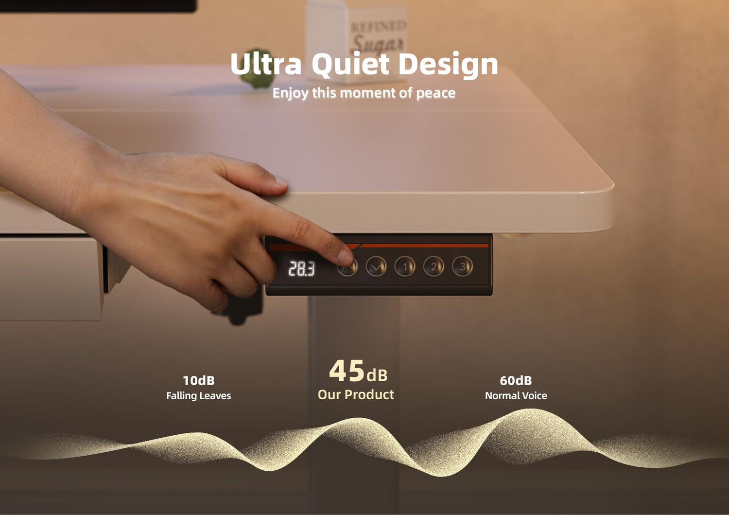 - Powerful Motor: Equipped with a powerful and durable motor, the height adjustable desk operates quietly while being energy-efficient. The noise level is about 45 decibels, providing you with a quiet working environment.