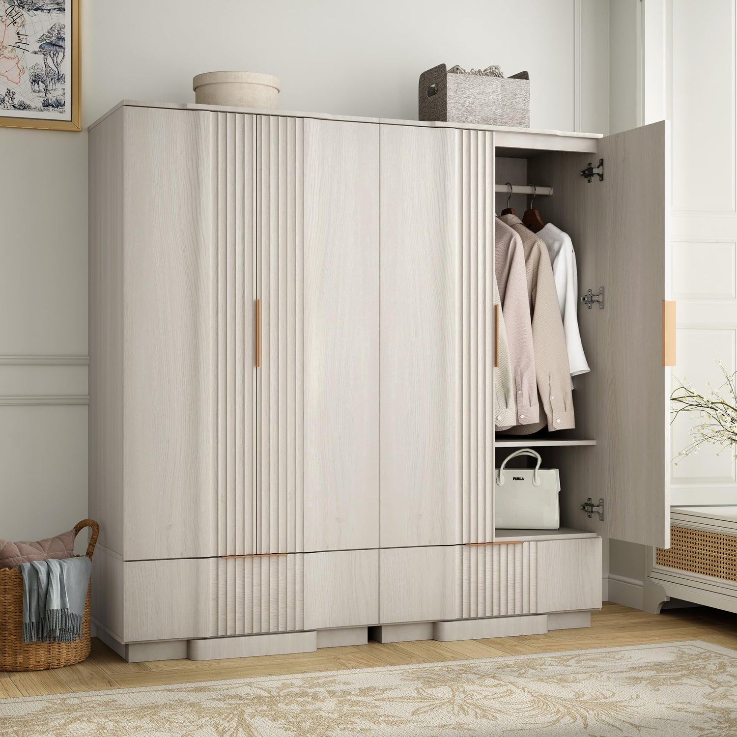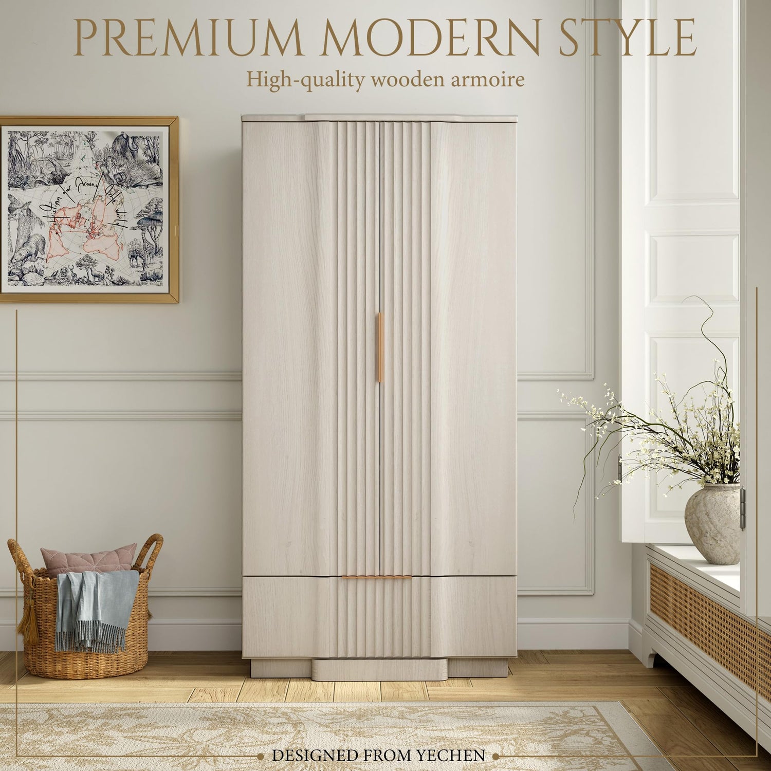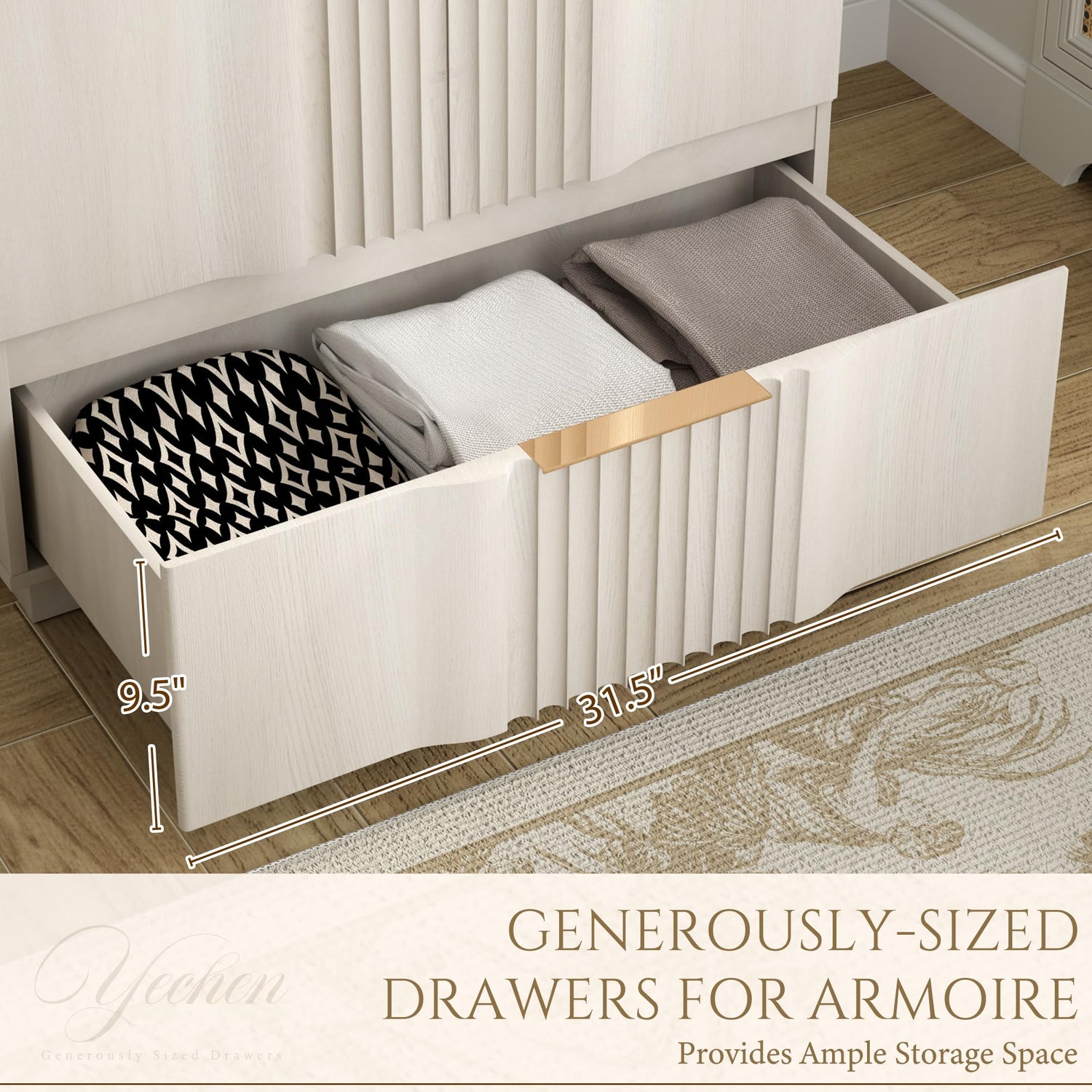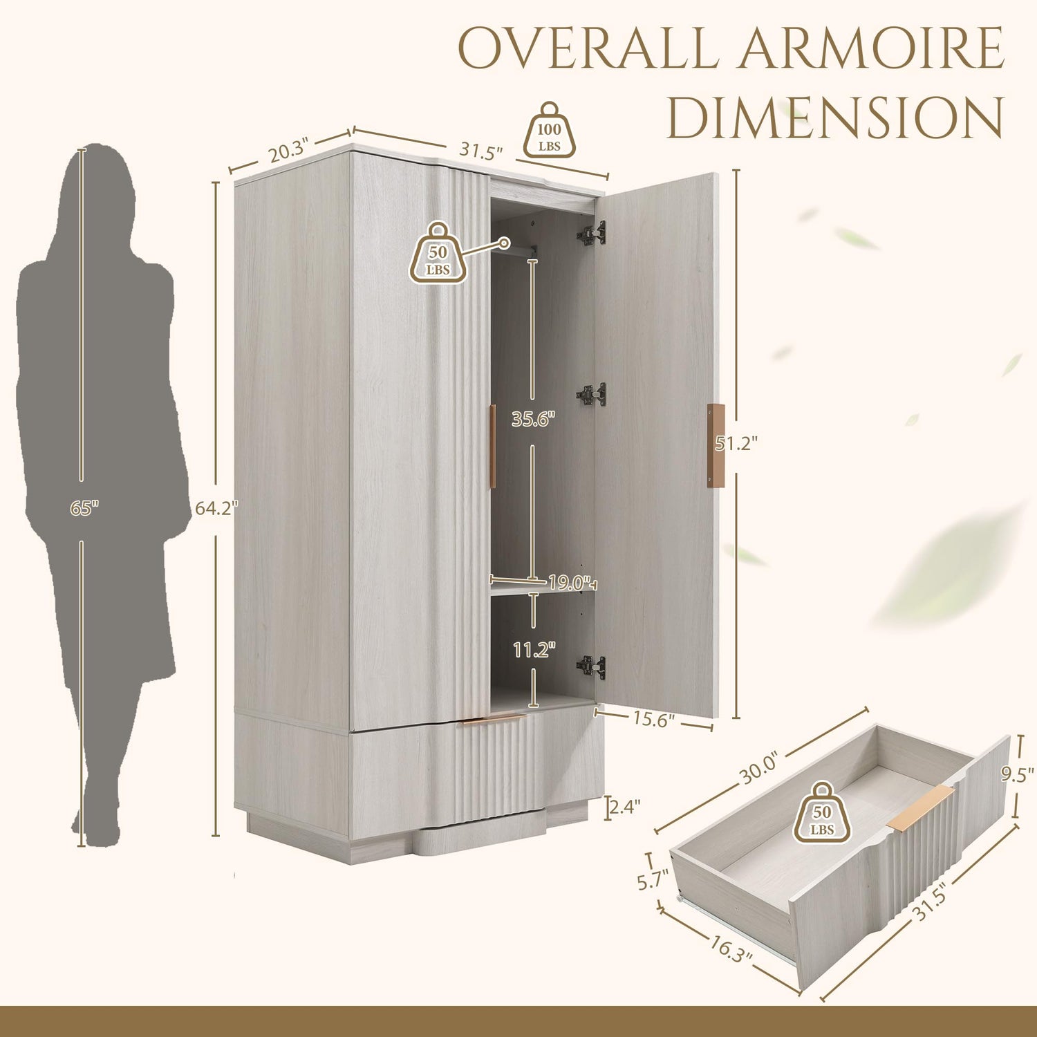 Yechen 64" Fluted Armoire Wardrobe Closet with Doors and Drawer, Wooden Wardrobe Cabinet with Adjustable Shelve, Modern Small Armoires for Hanging Clothes Coats for Bedroom, White Grey