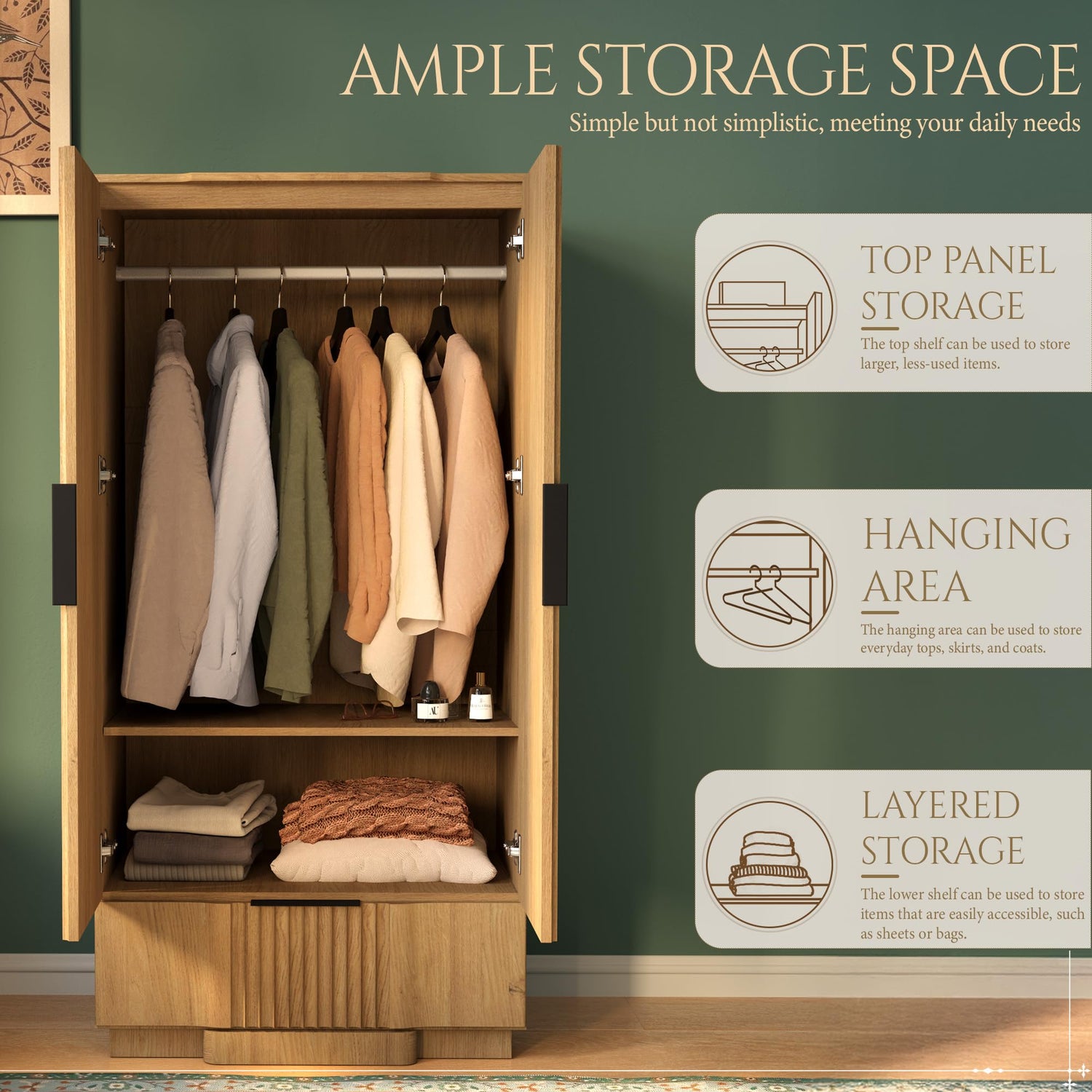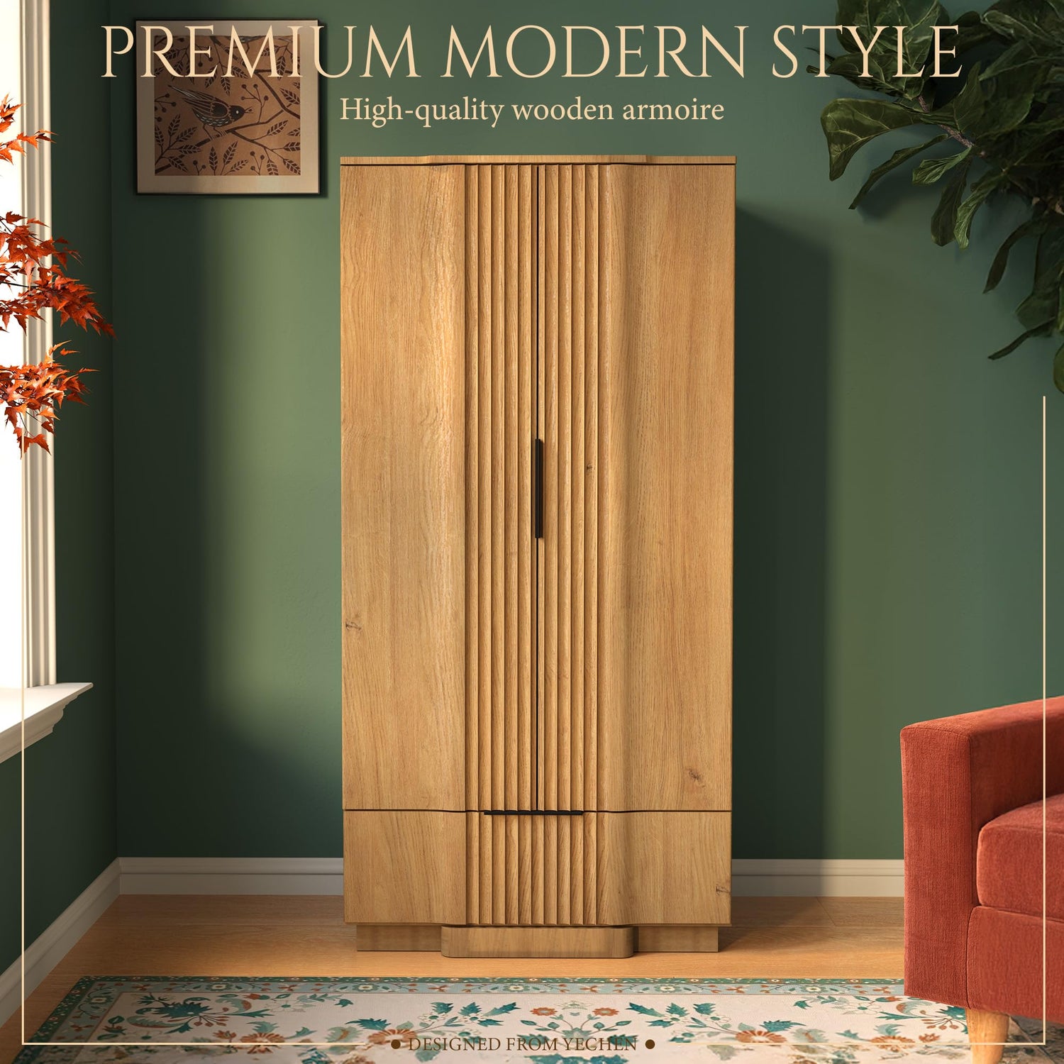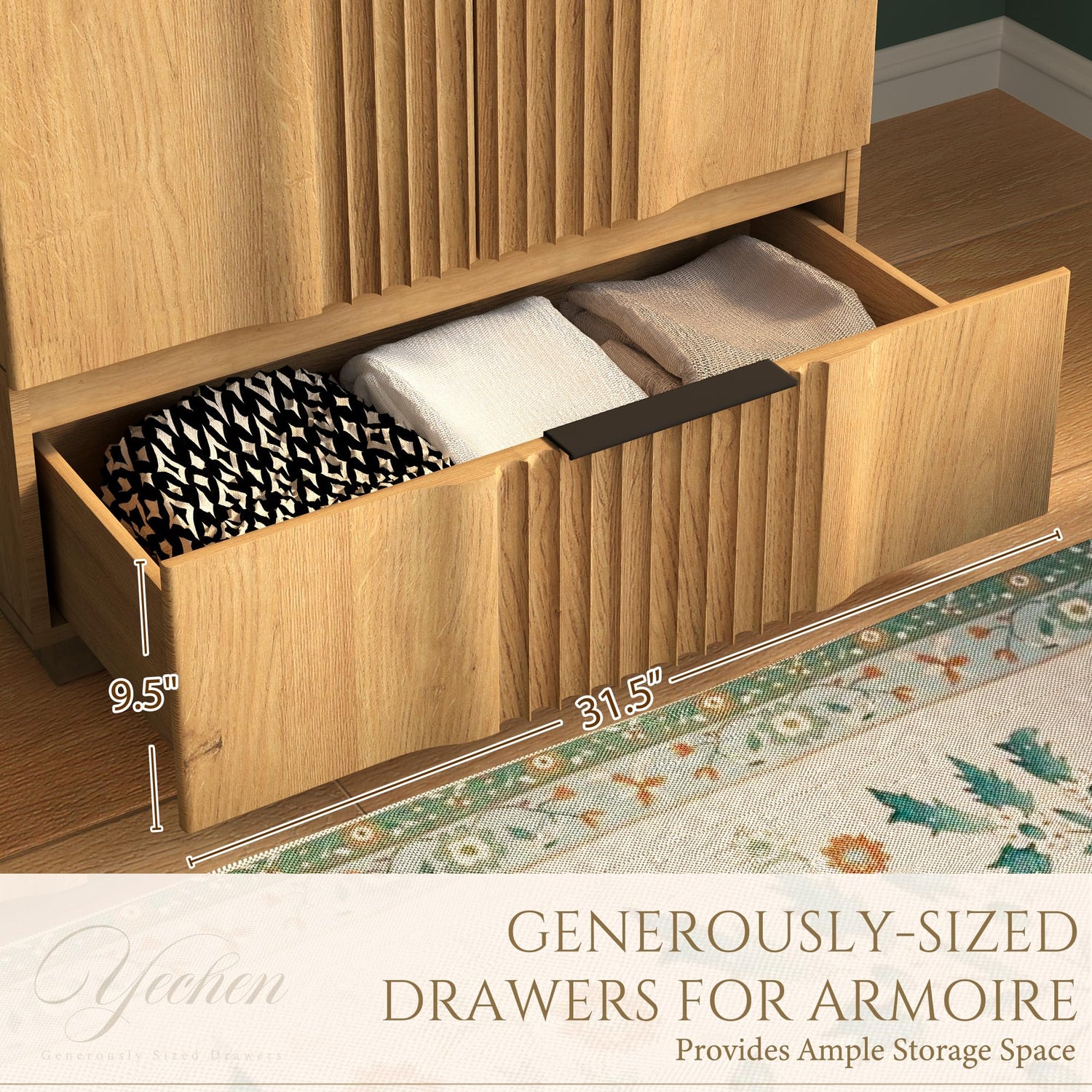 Yechen 64" Fluted Armoire Wardrobe Closet with Doors and Drawer, Wooden Wardrobe Closet Cabinet with Adjustable Shelve, Modern Small Armoires Storage Clothes, Coats for Bedroom, Natural