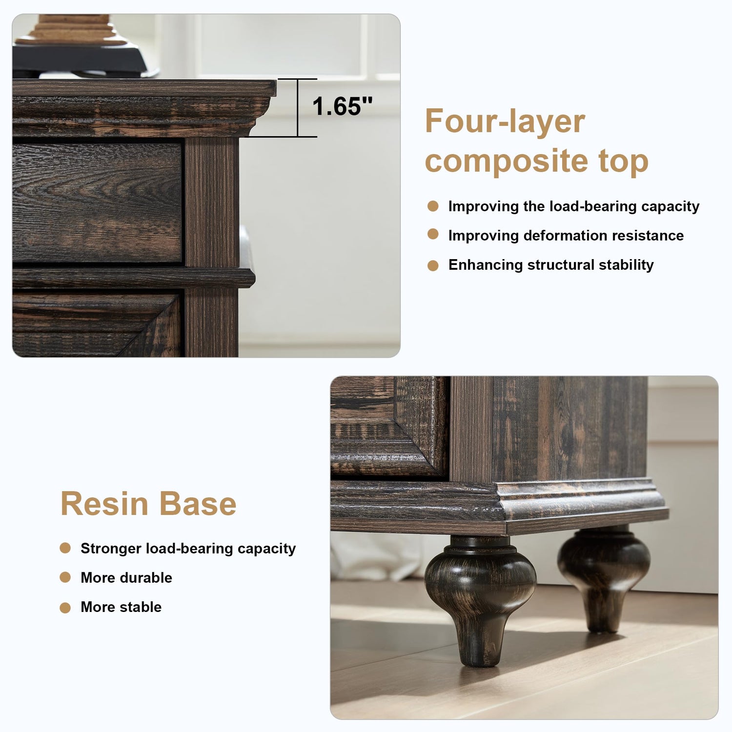 - CRAFTED FOR LASTING DURABILITY: The bedroom dresser is built from high-quality engineered wood with reinforced side columns. The wood dresser is supported by four sturdy resin bun feet and a central support leg for added stability. The thick, layered top enhances both strength and visual depth, making this a piece you can rely on for years of daily use.