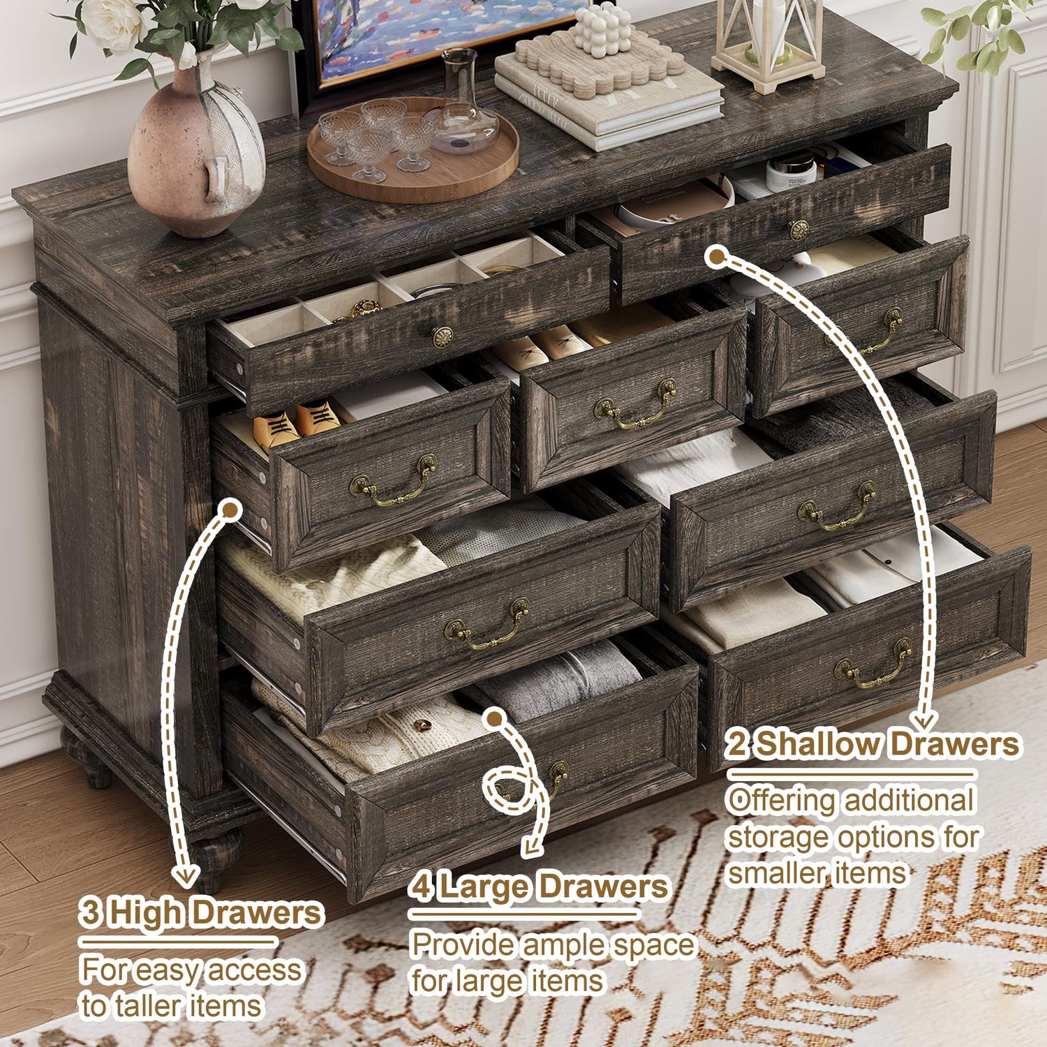 Yechen Farmhouse 9 Drawer Dresser for Bedroom - 47" Wide Modern Chest of Drawers, Rustic Thickened Wooden Dressers, Dressers Organizer for Living Room, Bedroom, Hallway