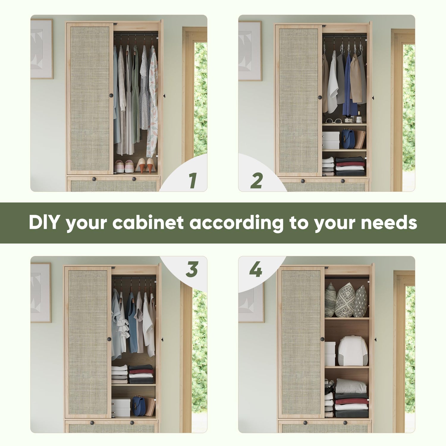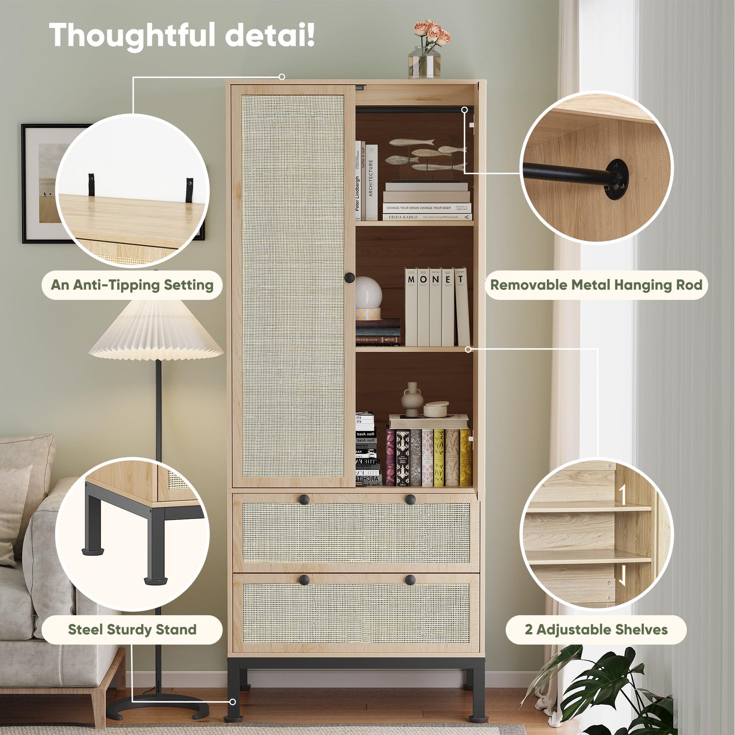 Yechen Natural Rattan Armoire Storage Cabinet, 74" Tall Armoire Closet with Doors, Adjustable Shelves and Drawers, Large Wooden Armoire Wardrobe with 2 Hanging Rods for Bedroom Utility Pantry