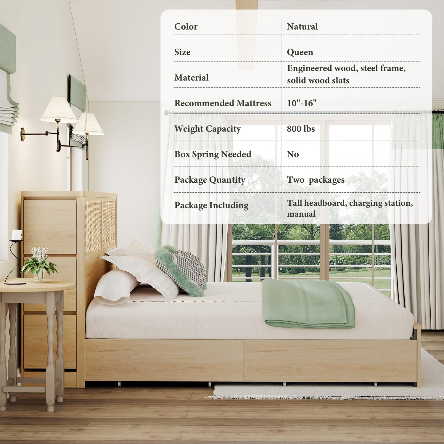 Yechen Natural Rattan Queen Bed with 10 Storage Drawers and Wide Storage Headboard, 48" Tall Boho Wooden Bed Frame Steel Stand and Charging Station, Sturdy Bamboo Bed, No Box Spring Needed/Noise Free