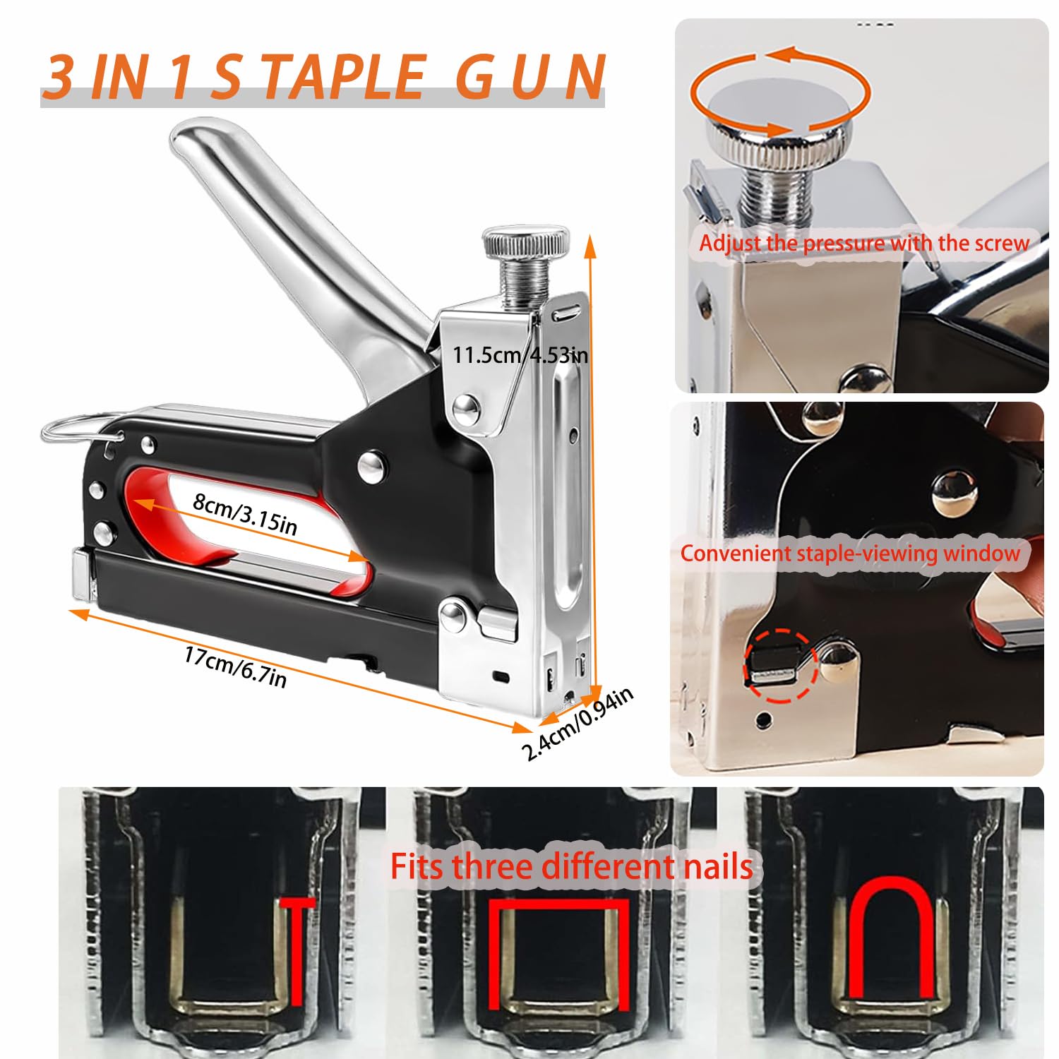 - [3 in 1 Heavy Duty Staple Gun] 3 in 1 Application - Suitable for 3 different staples/nails, such as D-shaped staples, U-shaped staples and T-shaped staples. Compatible with universal models: T50, T18, Brad nail gauge 18,Adjust the pressure by the screw button on the top of the heavy gun, to fit the thickness of the material you are using, which will make your upholstery work easier,with 1000 D-shaped staples, it can be used for a long time.