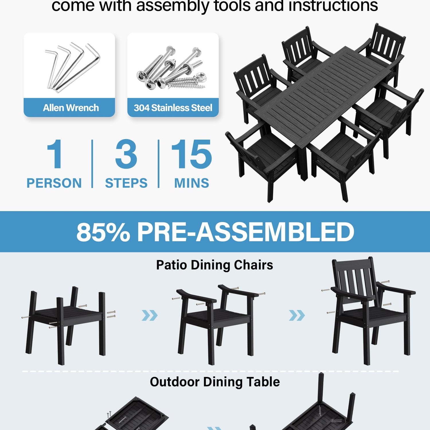 - Easy Assembly and 85% Pre-Assembled Outdoor Table and Chairs: YEFU patio dining sets have all necessary tools (allen wrench, 304 stainless steel screws) and clear installation instructions. 85% pre assembed, each table and chair require only 1 person, 10 mins to complete, allowing you to quickly set up your dining area, decorate the patio, and enjoy the fun of outdoor dining