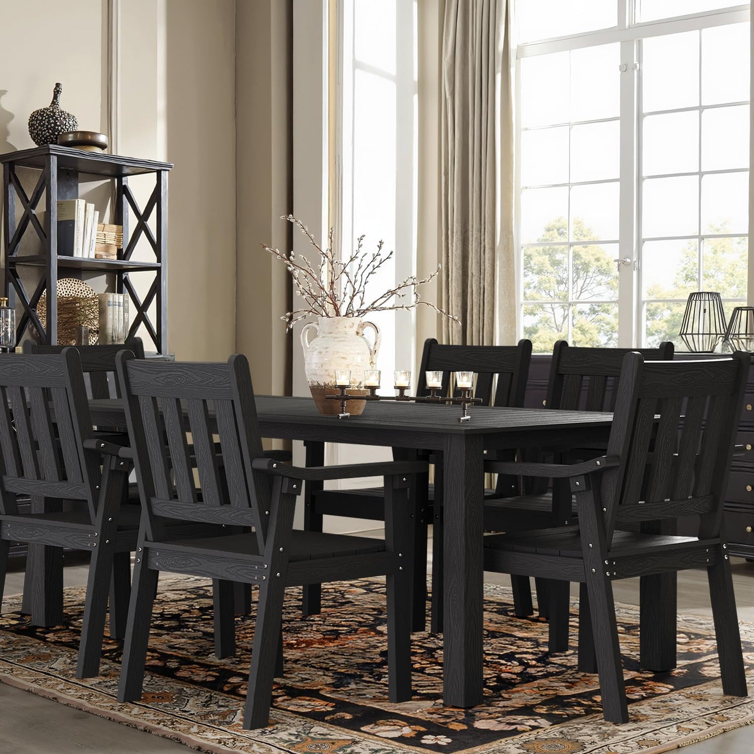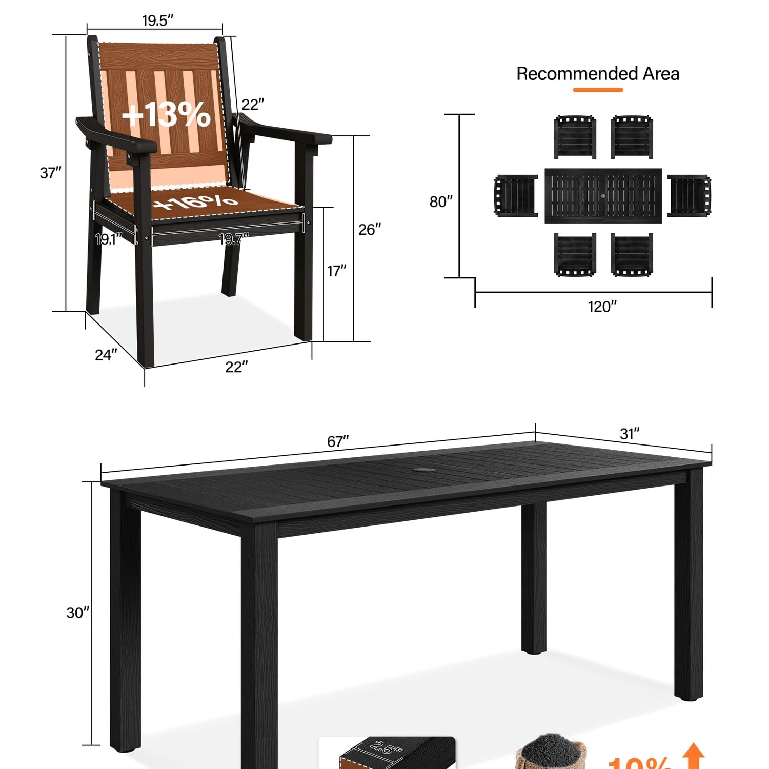 YEFU HIPS Patio Table Set: 7 Piece Outdoor Table and Chairs Dining Furniture Set with Umbrella Hole - Black Modern Plastic Dining Sets 6 Person for Outside Deck with Metal Aluminum Frame