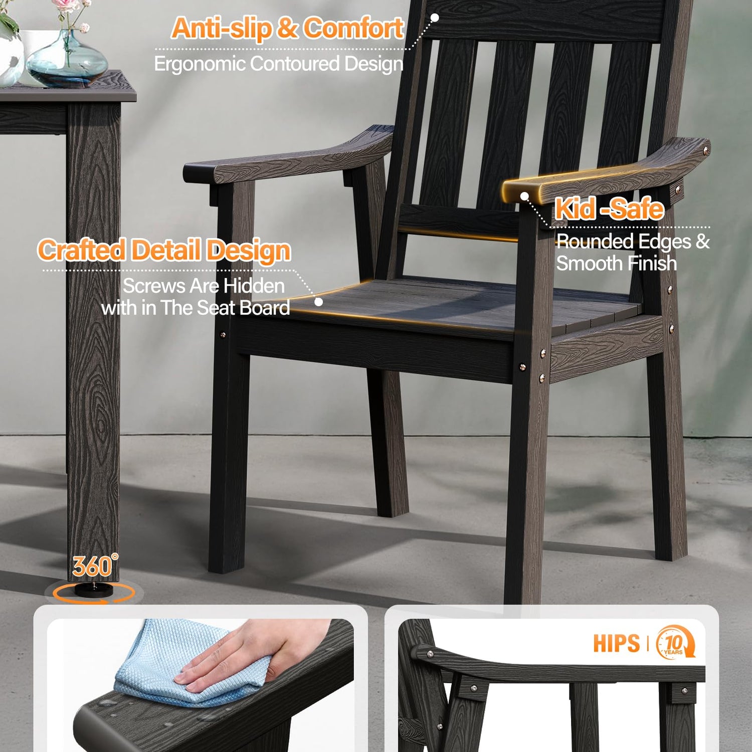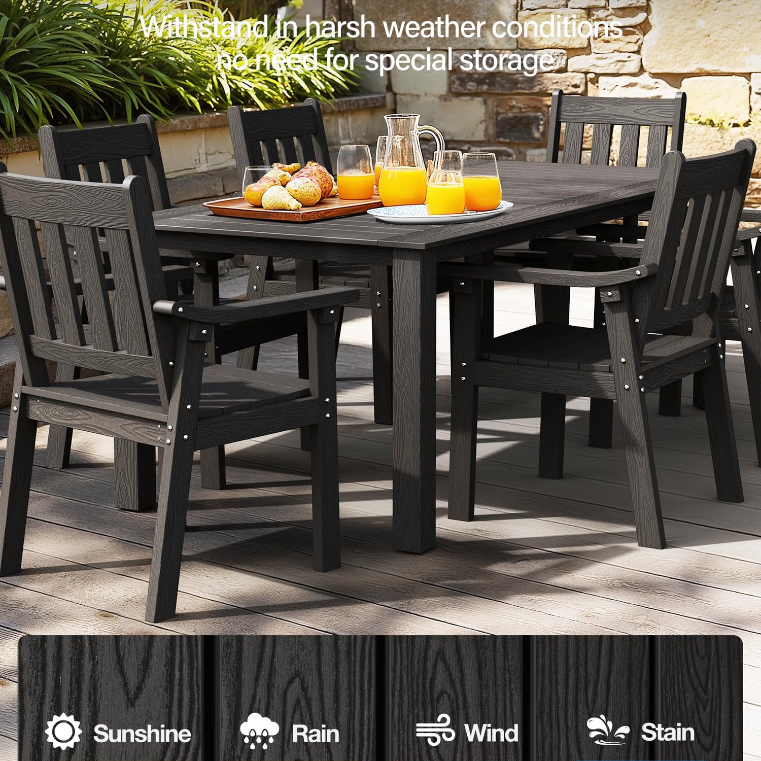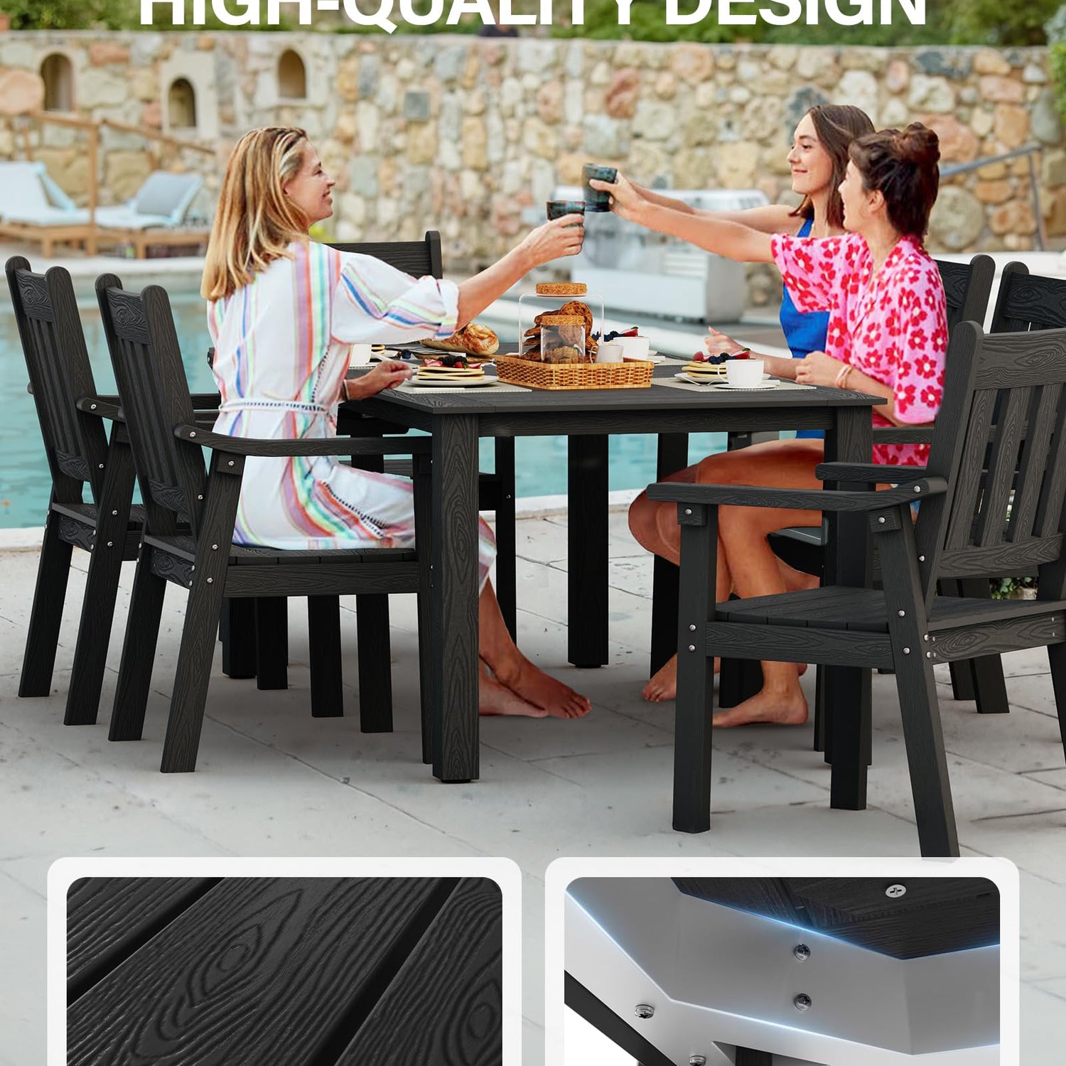 - Upgrade From HDPE to HIPS Material to Service Outdoor Condition Better: YEFU outdoor dining set for 6 is made of upgraded HIPS material which is harder than HDPE and more suitable for making patio table and chairs. HIPS make it not deform and maintain shape in cold and humid environments. It can withstand harsh weather conditions such as UV rays, rain, and wind. The outdoor dining table and chairs do not require special storage when placed outdoors and is suitable for patio, lawn, garden, porch, backyard, deck, pool, balcony