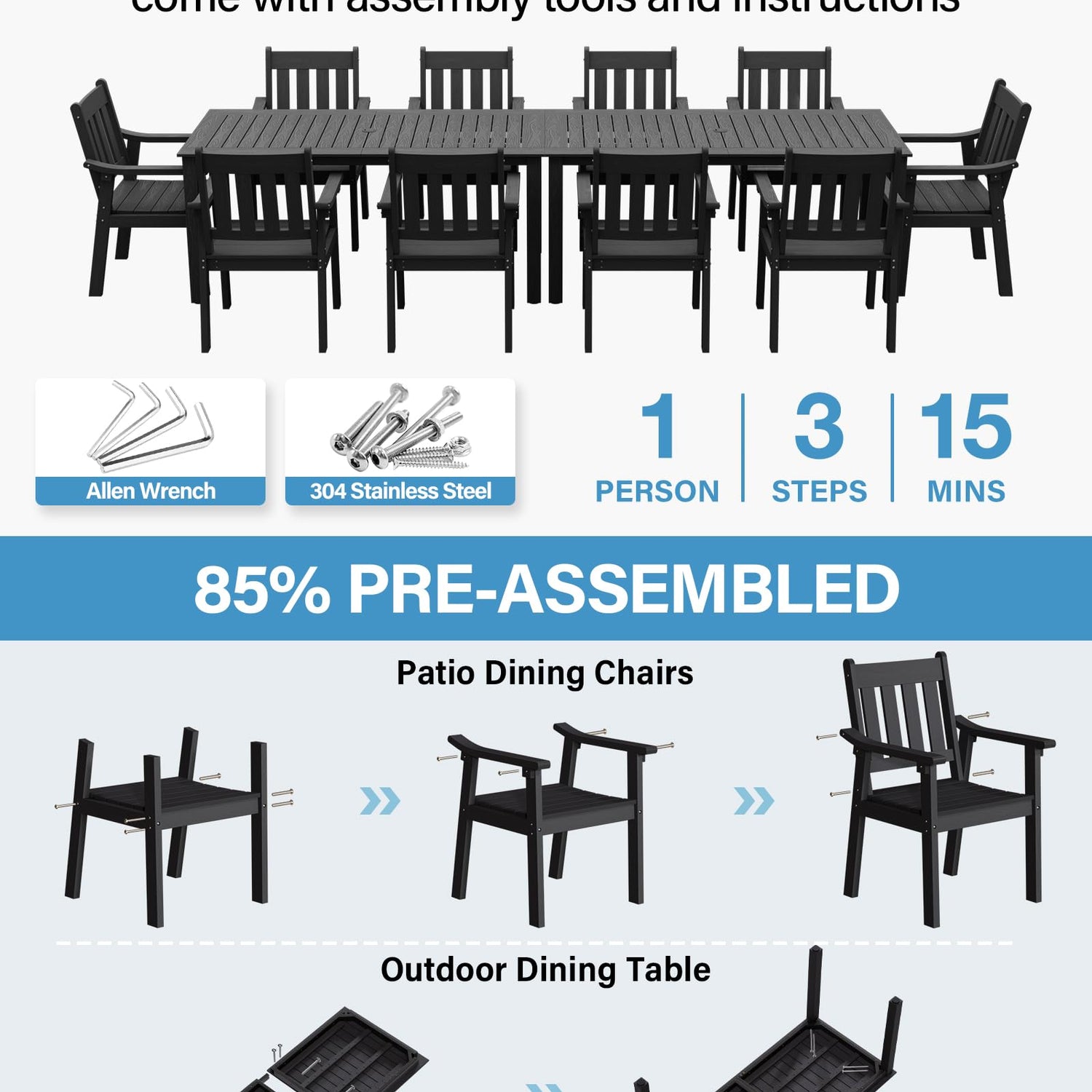 - Easy Assembly and 85% Pre-Assembled Outdoor Table and Chairs: YEFU patio dining sets have all necessary tools (allen wrench, 304 stainless steel screws) and clear installation instructions. 85% pre assembed, each table and chair require only 1 person, 10 mins to complete, allowing you to quickly set up your dining area, decorate the patio, and enjoy the fun of outdoor dining