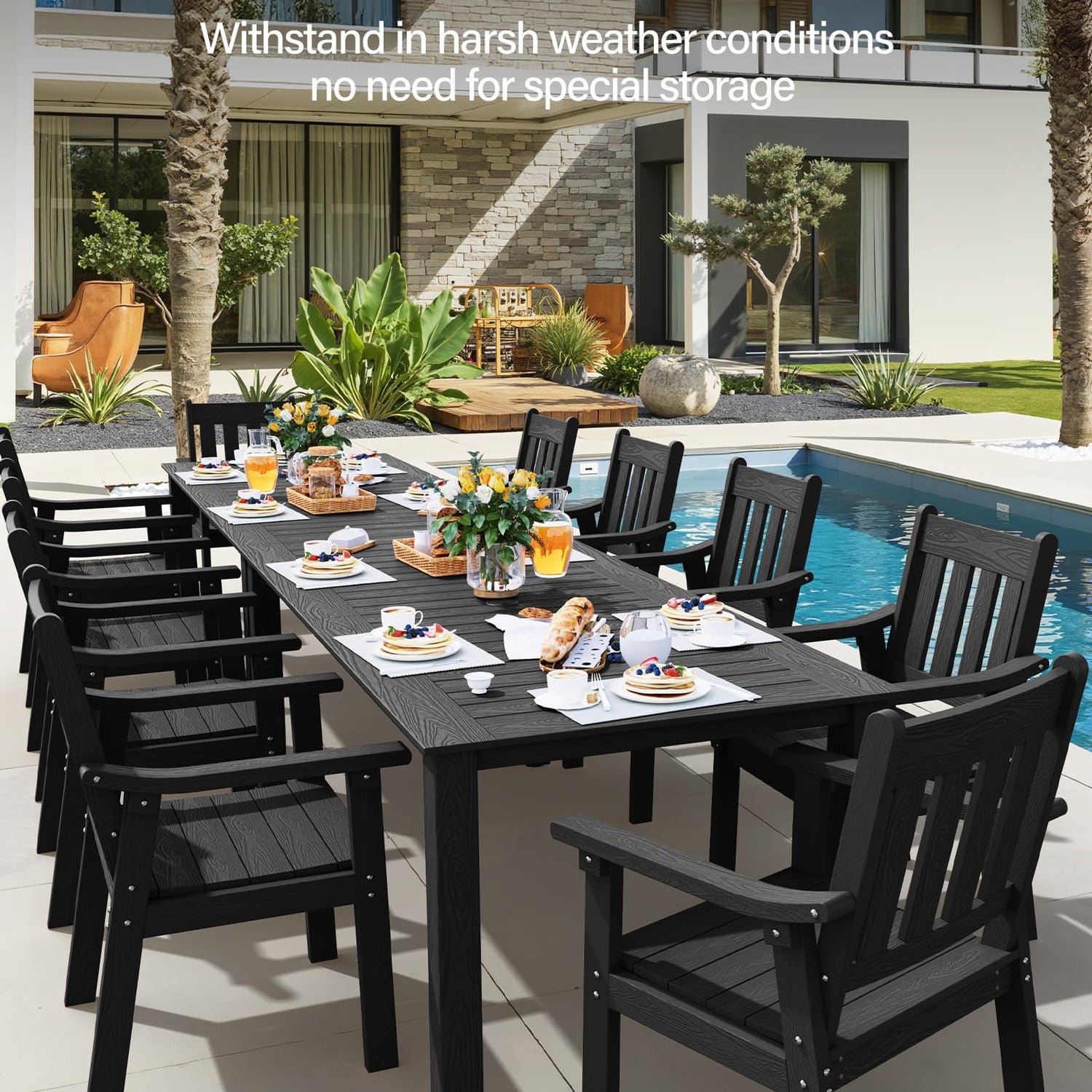 - Upgrade From HDPE to HIPS Material to Service Outdoor Condition Better: YEFU outdoor dining set for 10 is made of upgraded HIPS material which is harder than HDPE and more suitable for making patio table and chairs. HIPS make it not deform and maintain shape in cold and humid environments. It can withstand harsh weather conditions such as UV rays, rain, and wind. The outdoor dining table and chairs do not require special storage when placed outdoors and is suitable for patio, lawn, garden, porch, backyard, deck, pool, balcony