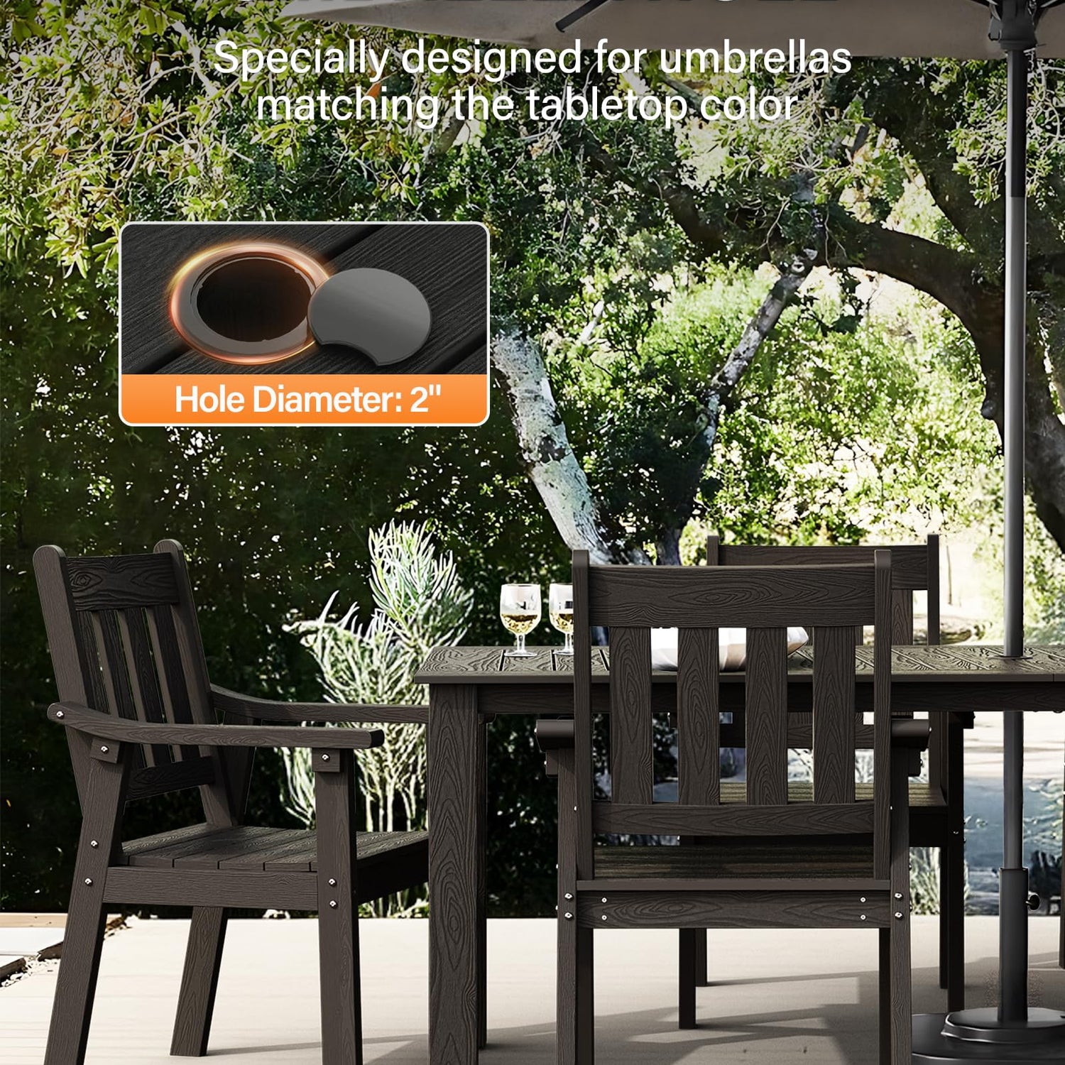 - Durable Table with Aluminum Frame, Adjustable Feet, Umbrella Hole: YEFU dining table features a coated aluminum frame under the table top that enhances stability and durability which make it maintain shape well after long-time use. YEFU table of the outdoor dining sets is specially designed with umbrella holes, which can be used with a umbrella and allows you to have a pleasant meal in the shade. Table Top Size:67"x31"x30", Weight Capacity: 300 lbs, for 10 person
