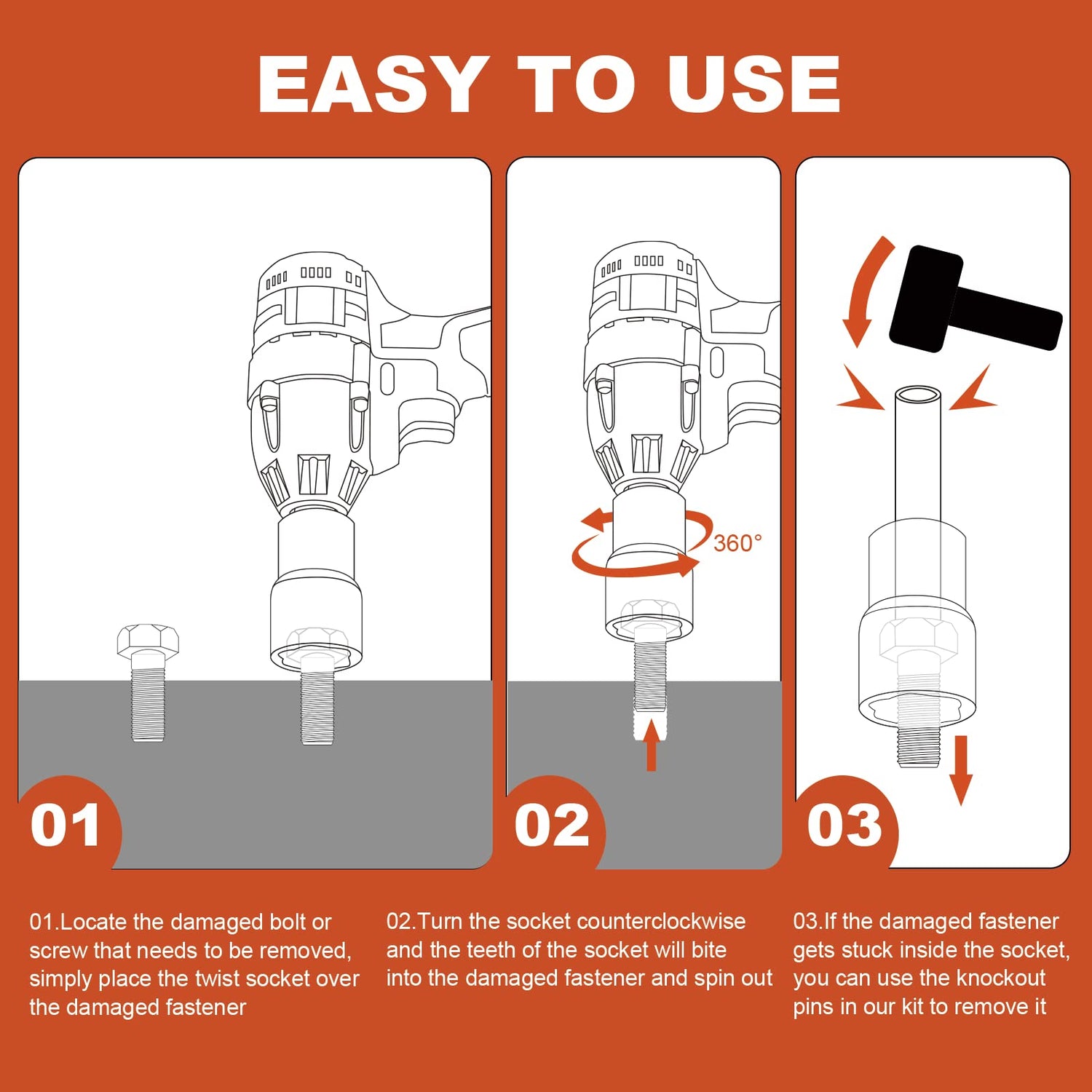 - EASY OUT BOLT EXTRACTOR SET: Just place the socket onto the damaged fastener and turns it with an impact wrench, power drill, hand ratchet, breaker bar, etc. Tapped the nut out of the socket with supplied round bar and you were done