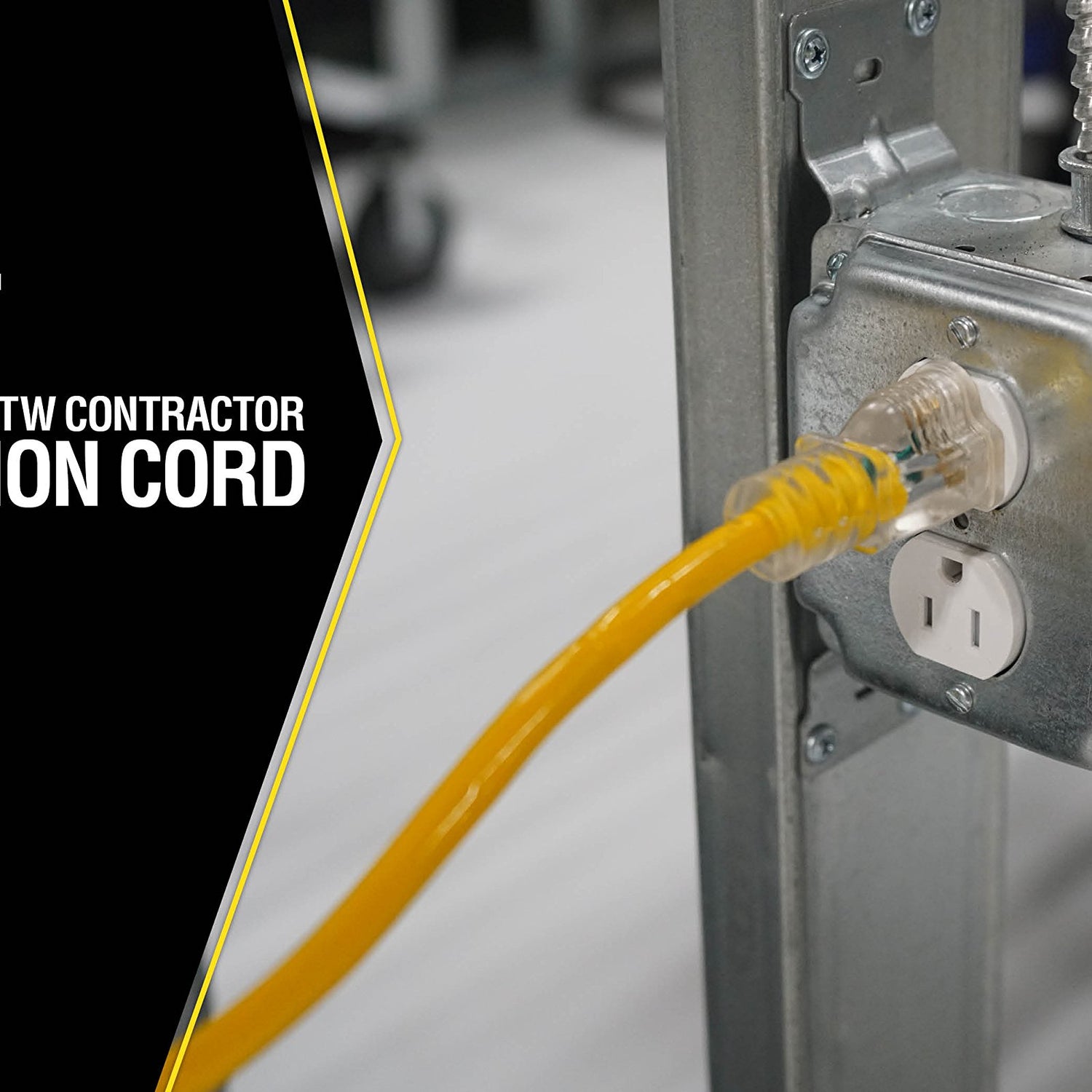 Yellow Jacket 2884 12/3 Heavy-Duty 15-Amp SJTW Contractor Extension Cord with Lighted Ends, 50-Feet. Exclusive Yellow Jacket compound is more flexible and abrasion resistant at any temperature than standard vinyl compounds. Power Lite power indicator lamp glows through the extra heavy, clear molded plug when the cord has power. Extra heavy, clear molded plugs are rugged, durable and oversized. Suitable for Industrial and construction job site power. Meets OSHA specifications, UL Listed. 12 Gauge. The Yellow Jacket (R) brand is a registered trademark of Coleman Cable Inc.