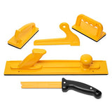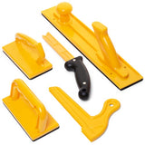 Details: SET INCLUDES: 2 push blocks (1 angled handle and 1 offset push block), 1 push block, 1 standard push stick and 1 narrow stock push stick. Our 5-piece safety kit is designed to be your go-to, essential safety kit for use on the jointer with the large push block, routing operations or resawing with the smaller push blocks, table saw use with push sticks including thin stock cutting the narrow push stick. Our large and small push blocks are constructed of a thick, heavy-duty plastic and feature durable yet grippy foam pads not only providing exceptional comfort and control, but durability for repeated use across a variety of woodworking processes. Each piece of the 5-piece safety kit is designed to keep your hands away from blades and cutter while providing comfort and optimal control of your workpiece through the entire operation. Our safety kit is bright yellow! This allows you to easily locate your safety kit pieces for use from anywhere in your shop, see where your hands are in relation to the cutter or blade when using while keeping your hands well out of harm's way.