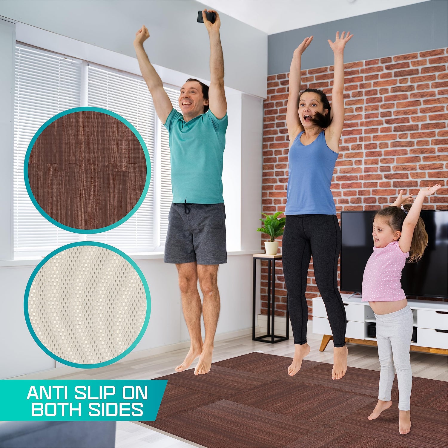 - CUSTOMIZABLE COVERAGE: Woof grain foam floor tiles set includes 12 foam tiles, covering 12 square feet; Easily assemble and adjust to fit your space requirements, whether it's a living room, home gym, basement, or garage