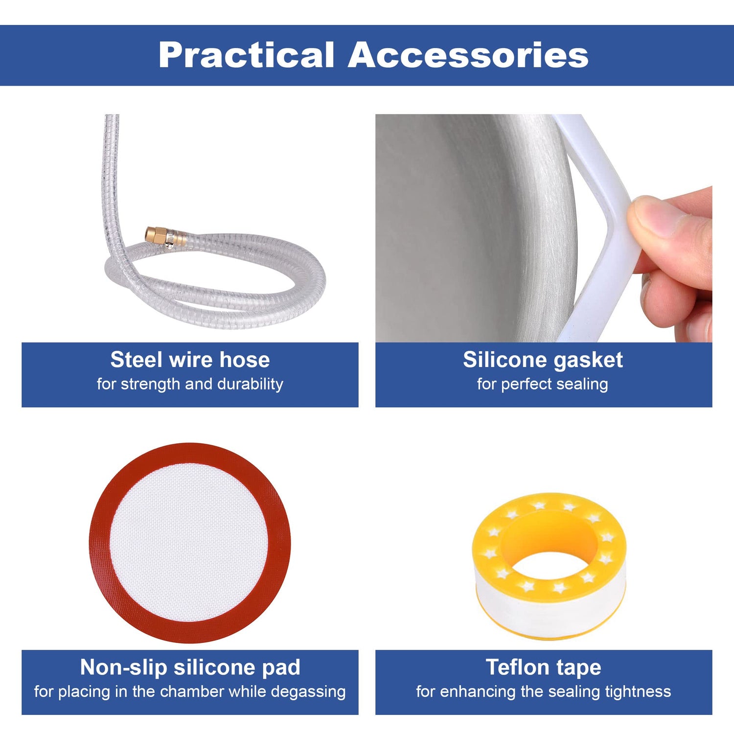 - Practical Accessories - Steel wire hose for strength and durability; non-slip silicone mesh pad for placing in the chamber while degassing; Teflon tape for enhancing the sealing tightness of joints