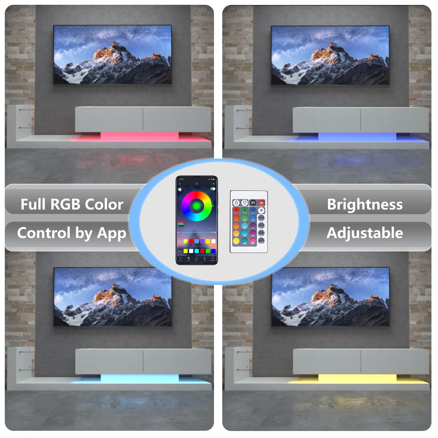 - MODERN LED TV STAND - This modern LED TV cabinet has LED strips fixed underneath the two front doors to create different lighting effects for a more layered look. You can control the LED lights through the app or remote control, and it allows for full RGB color conversion, as well as 31 light transition modes to make your TV host look even more dazzling
