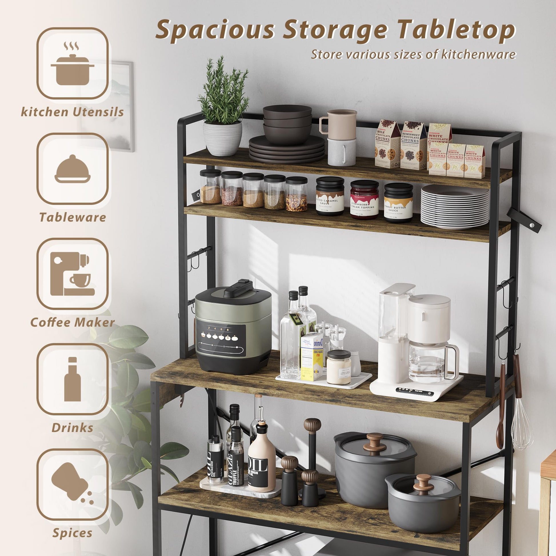 YESHOMY Kitchen Baker’s Rack with Power Outlet, 5-Tier Microwave Stand, Coffee Bar with 8 S-Shaped Hooks, Heavy Duty Storage Shelf Unit for Spices, Pots, Rustic Brown