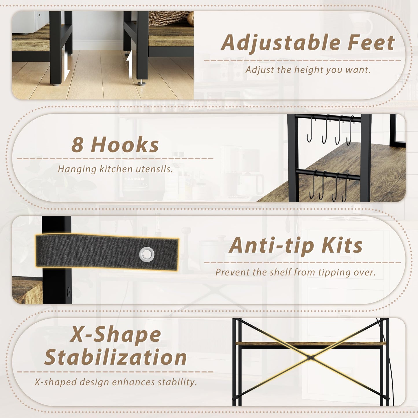 Details: YESHOMY Kitchen Baker’s Rack with Power Outlet, 5-Tier Microwave Stand, Coffee Bar with 8 S-Shaped Hooks, Heavy Duty Storage Shelf Unit for Spices, Pots
