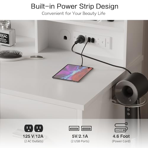 - YESHOMY Vanity Desk with Mirror, Power Outlet and 10 Lights, Makeup Table with 4 Drawers, 3 Color Modes Available for Bedroom, White