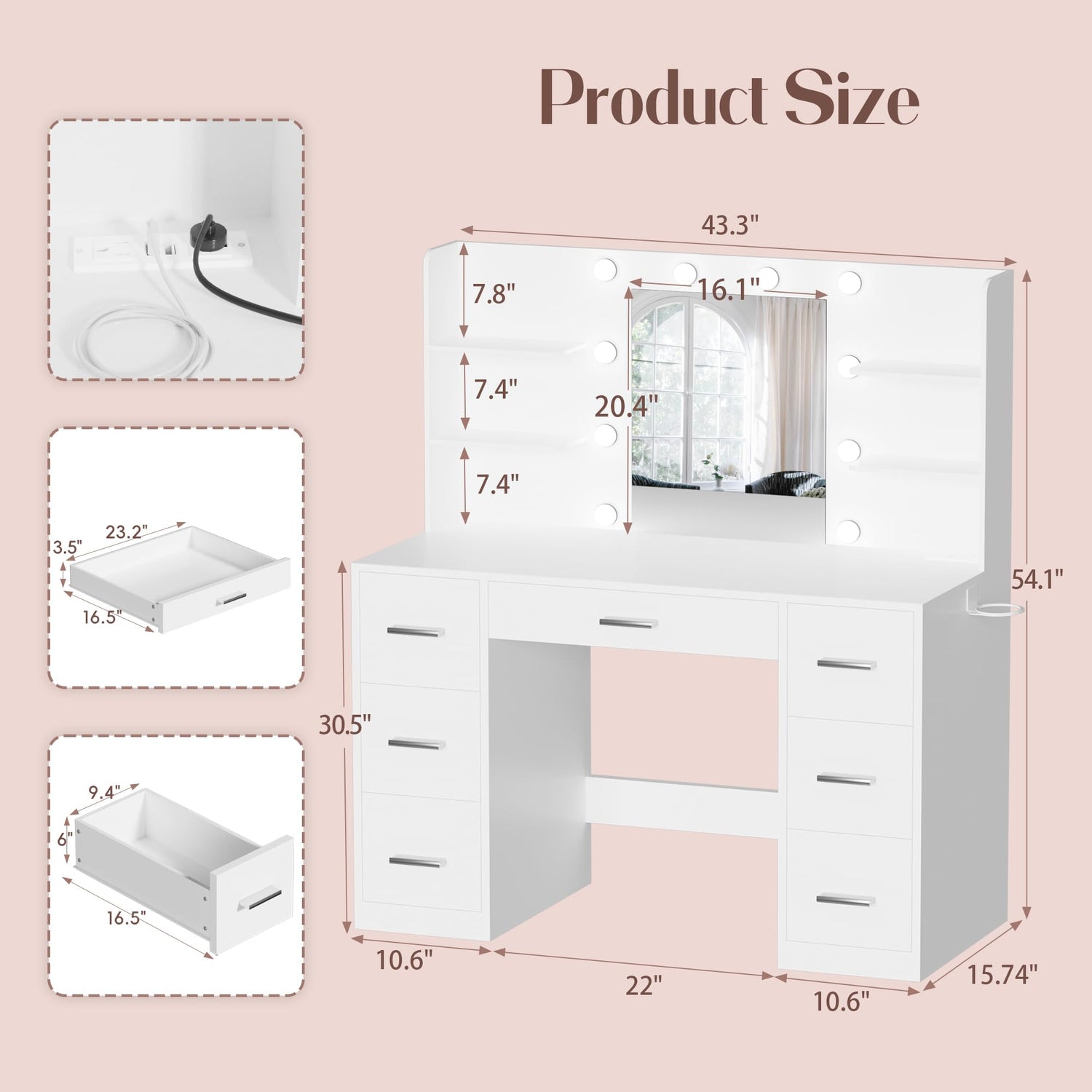 - Elegant Vanity Desk: The vanity table is in great modern style. Paired with lights, it has both practicality and aesthetics. With the decoration of the desk, your room will be more livable and beautiful.