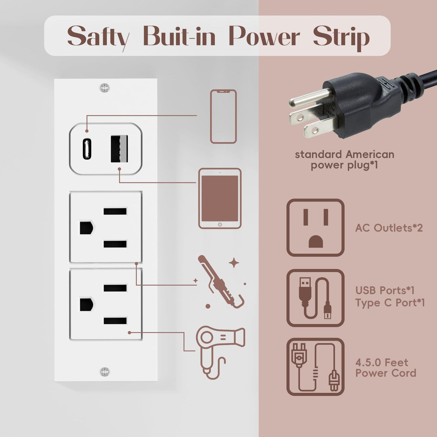 - Power Outlet: The vanity bench is equipped with two sockets and two USB ports. It provides great convenience for charging your phone or other electronic device.